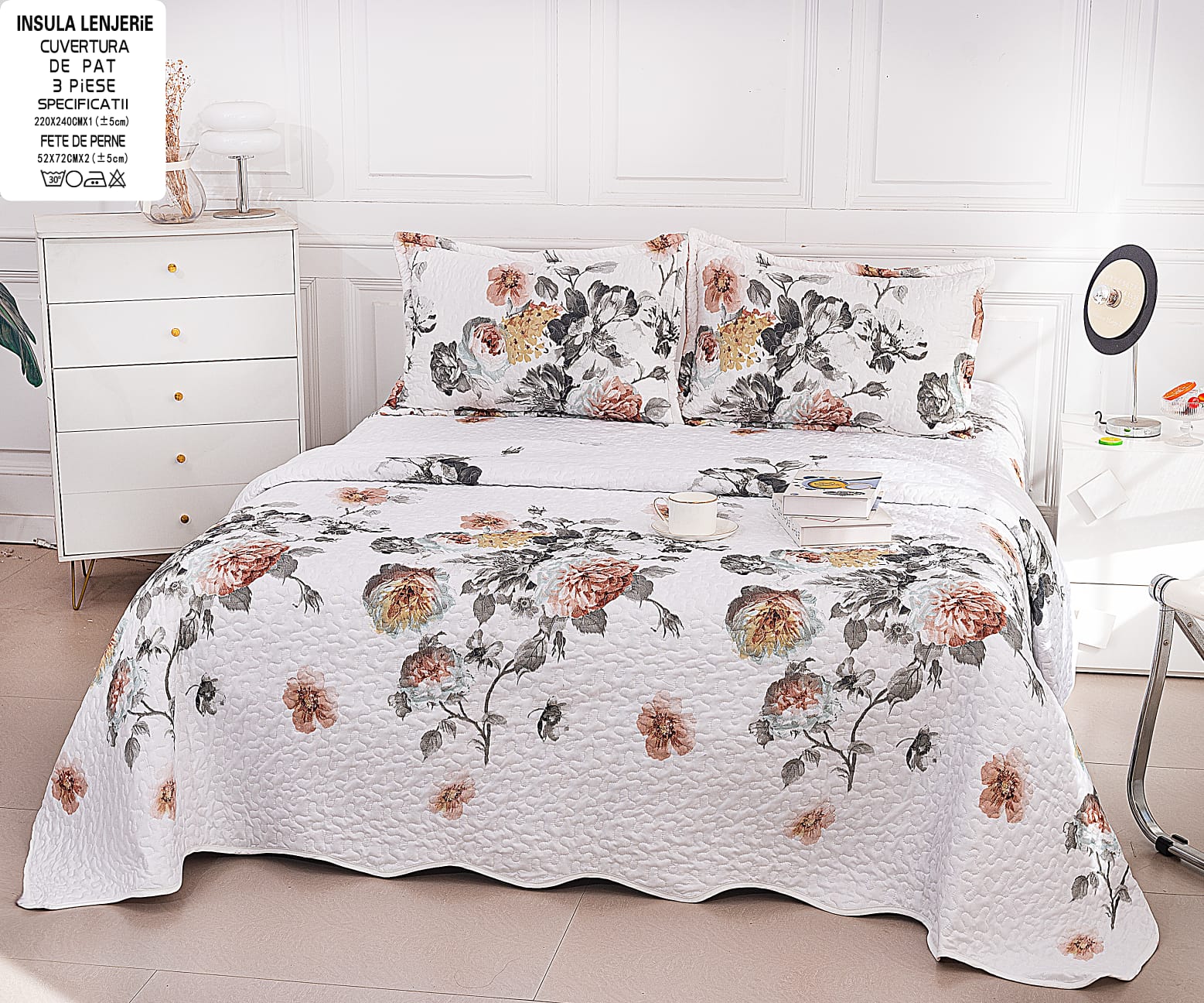 Cuvertura De Pat 3 Piese, din Bumbac Satinat, Floricele-A9835