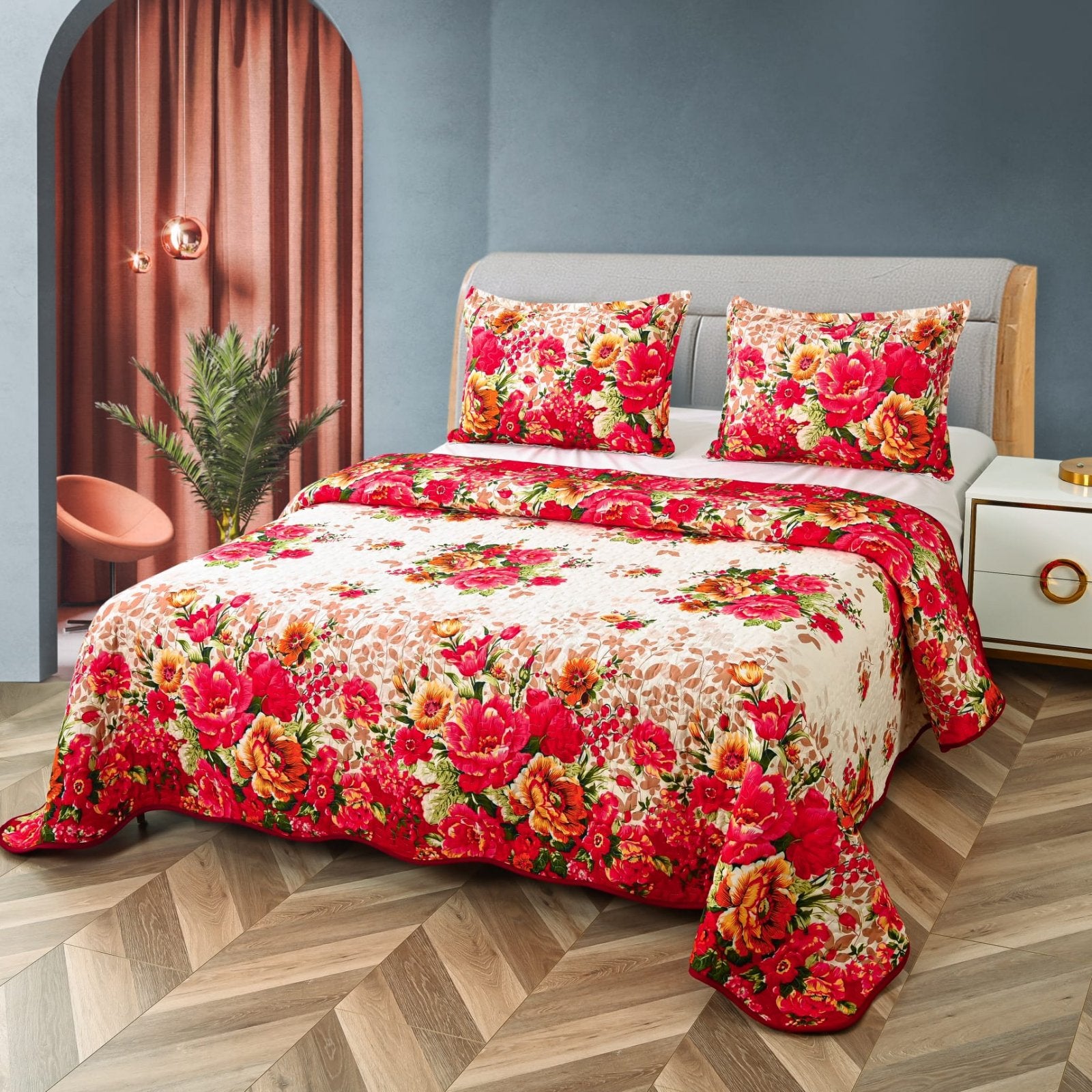 Cuvertura De Pat 3 Piese, din Bumbac Satinat, Rosu/Flori-A5927