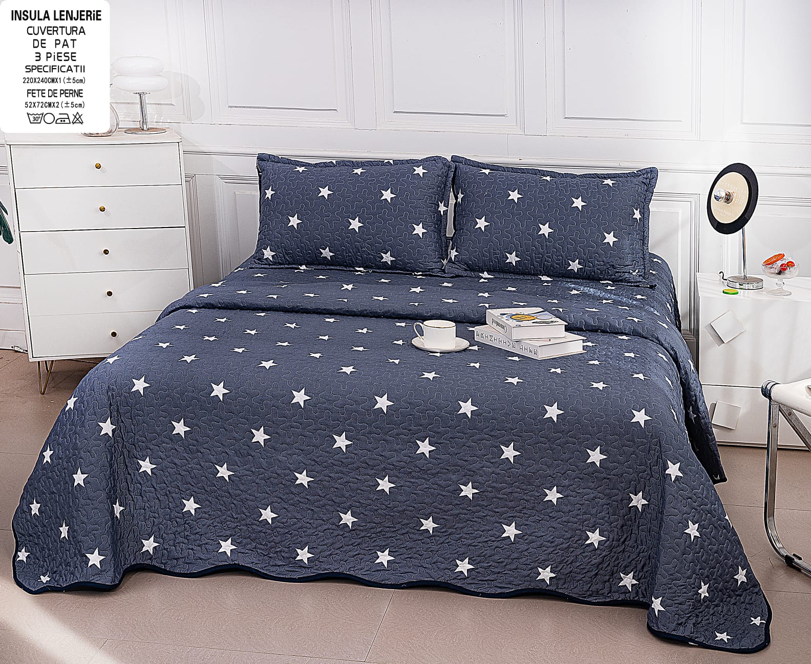 Cuvertura De Pat 3 Piese, din Bumbac Satinat, Stelute-A9856