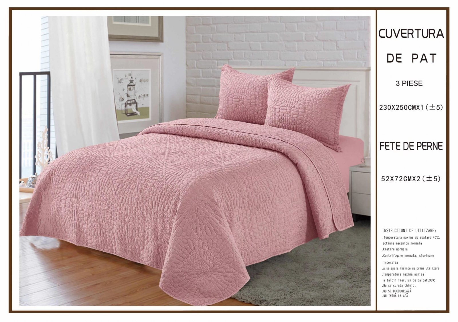 Cuvertura De Pat Matlasata, din Bumbac Satinat, cu 3 Piese, Roz-A8149