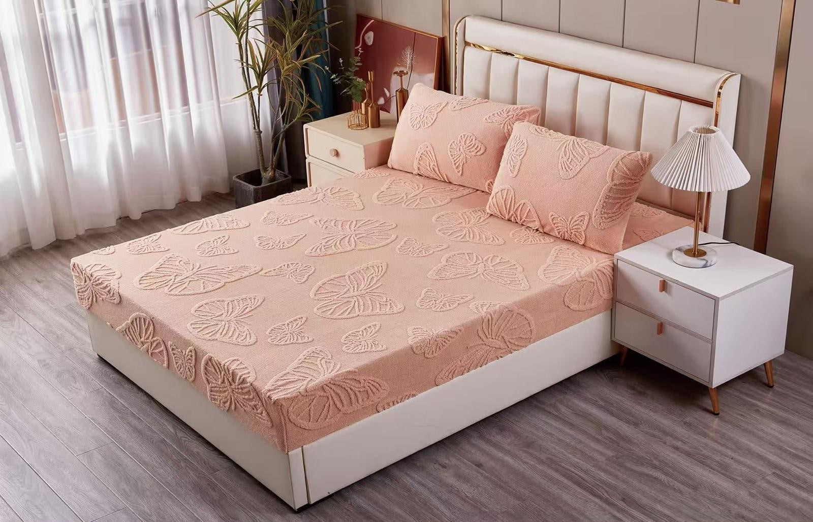 Confectionată din material pufos, perfect pentru sezonul rece. Se fixează ferm pe saltea datorită elasticului și vine cu 2 fețe de pernă asortate.