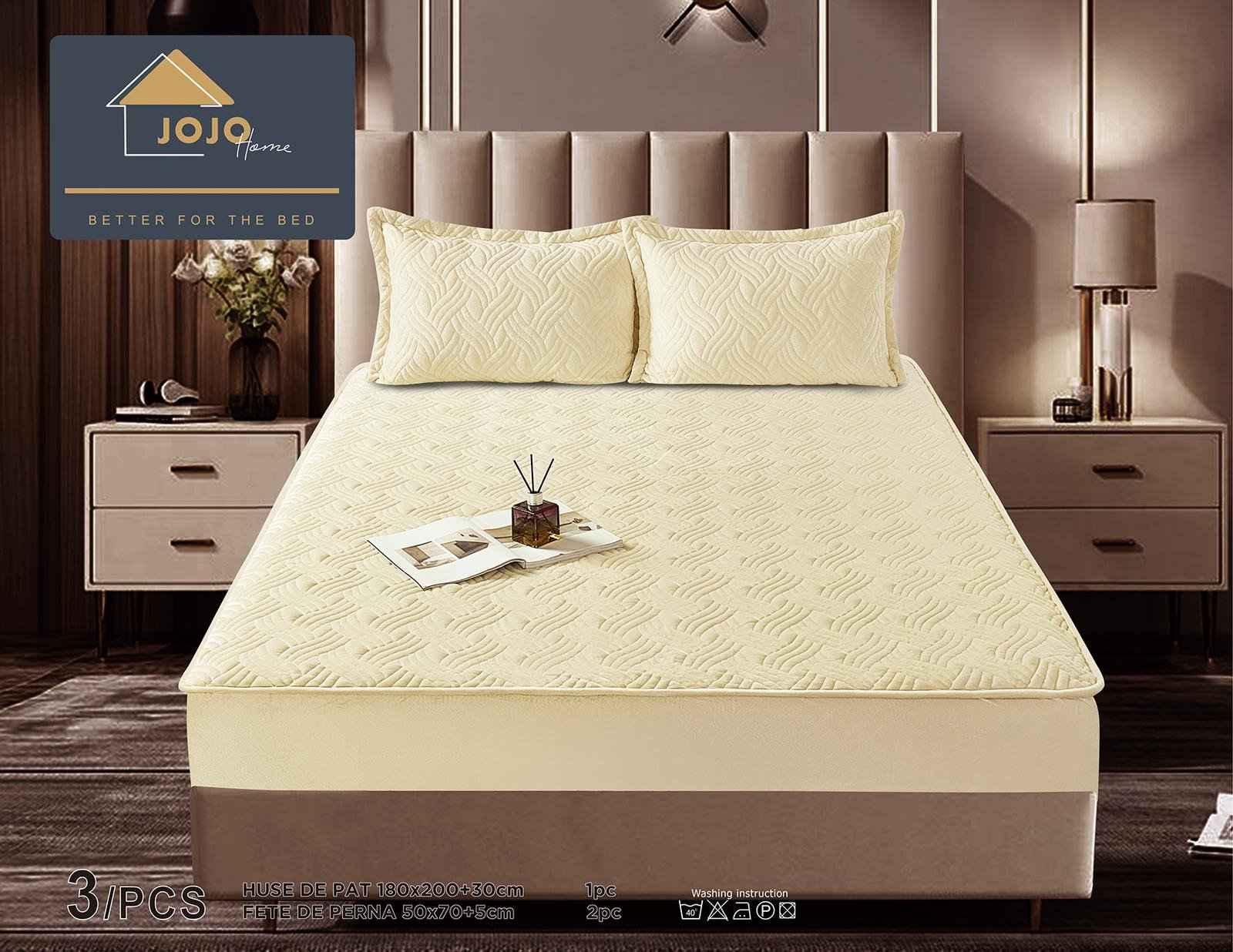 Husa matlasata tip topper din catifea,180x200cm+2 fete de perna 50x70cm, Crem