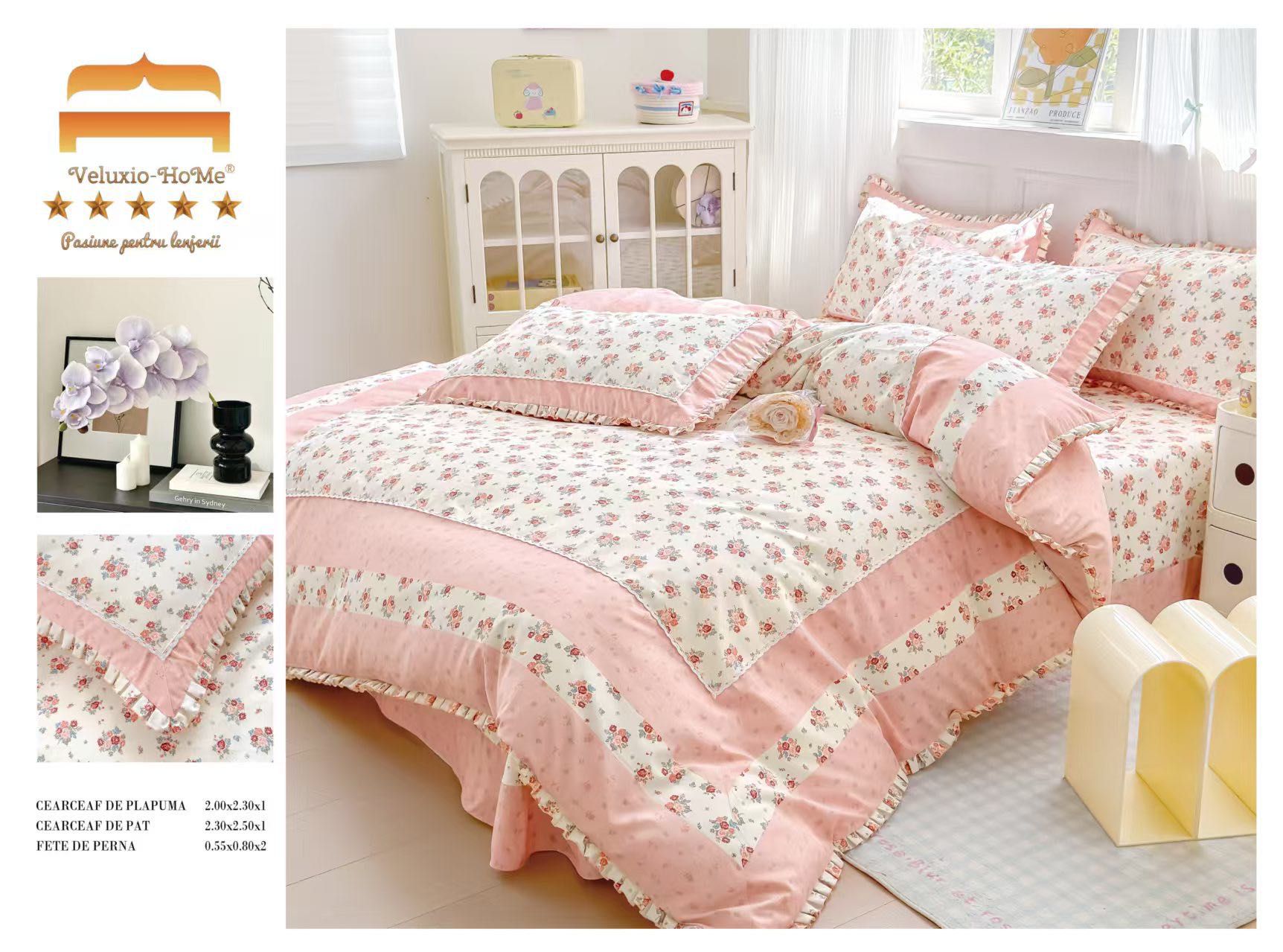 Lenjerie Bumbac Finet Premium 4 Piese cu Volanase, Flori-M9559