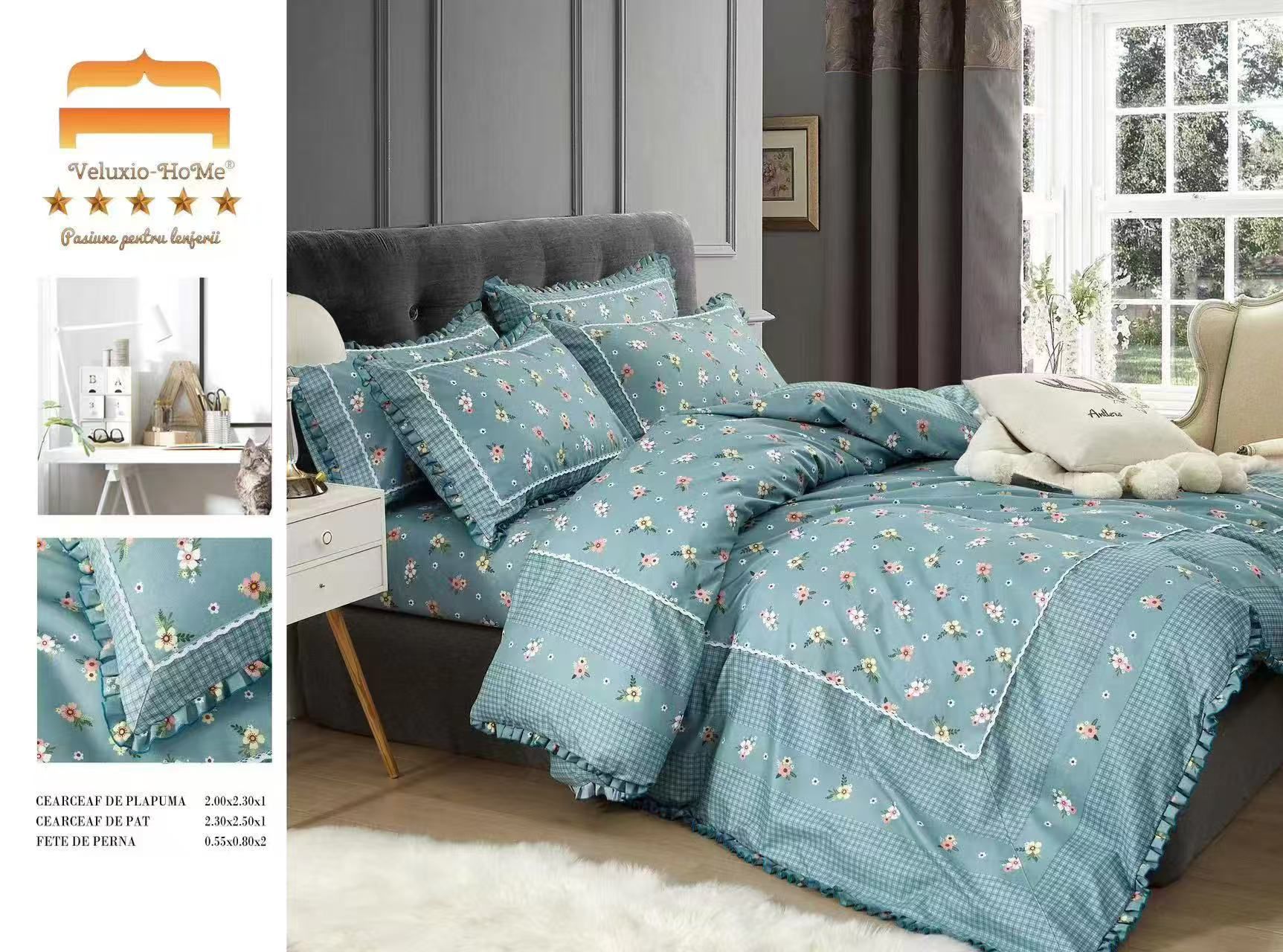 Lenjerie Bumbac Finet Premium 4 Piese cu Volanase, Floricele-M9570