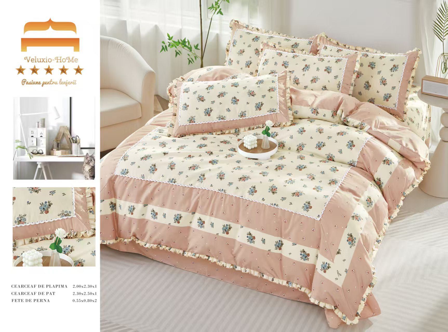 Lenjerie Bumbac Finet Premium 4 Piese cu Volanase, Floricele-M9573