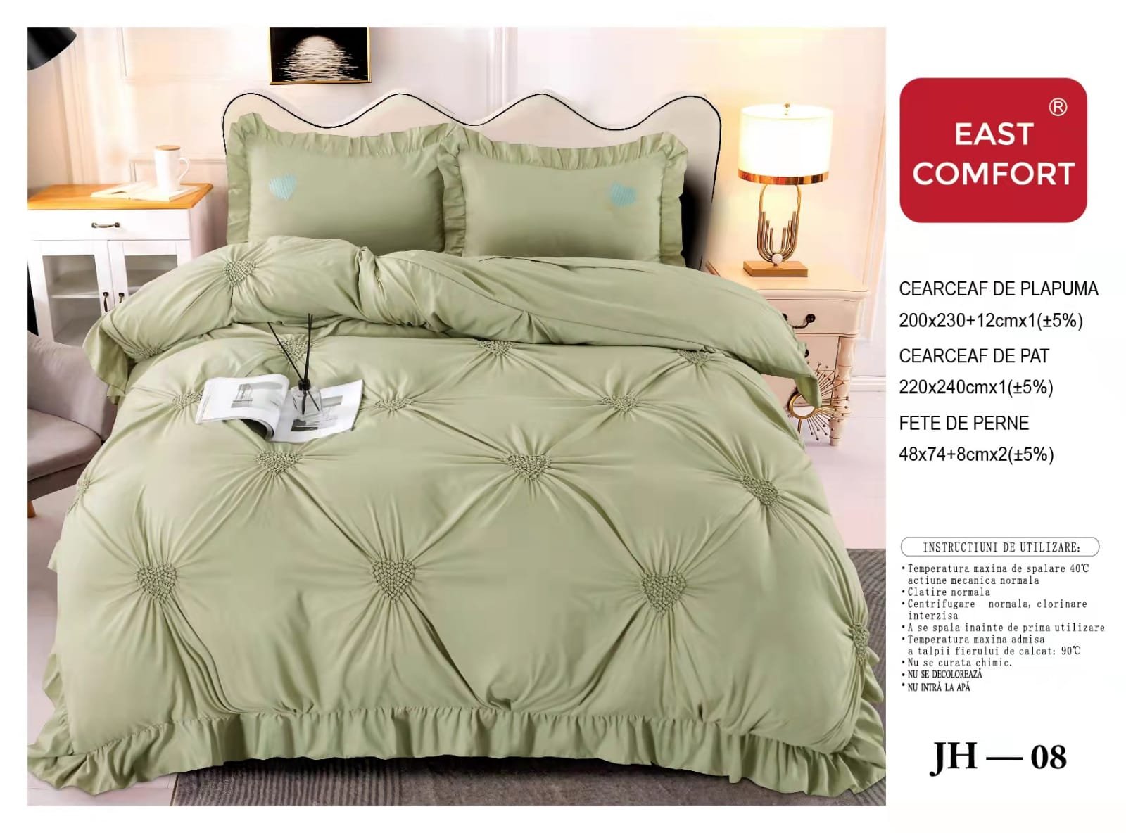 Lenjerie Bumbac Finetat Soft Touch, 4 Piese cu Inimi Brodate, Verde-D5417
