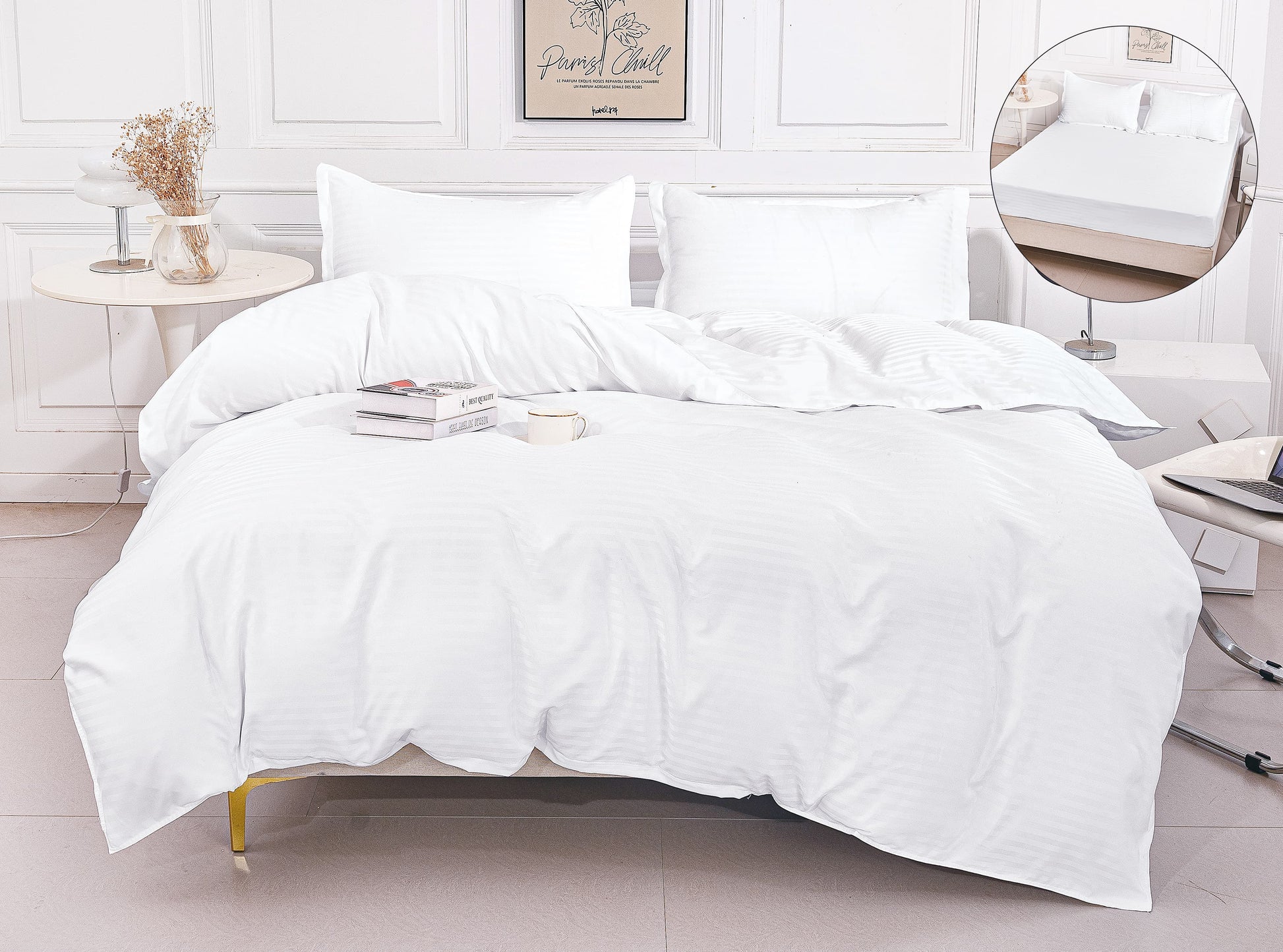 Lenjerie Damasc Finetat 4 Piese cu Elastic, Alb, Uni-A9814