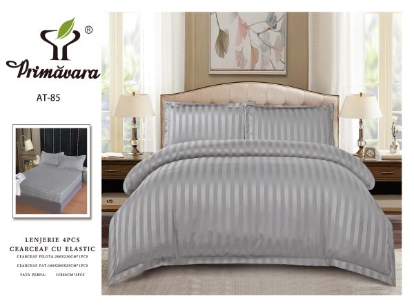 Lenjerie Damasc Finetat 4 Piese cu Elastic, Gri Deschis, Uni-P9609