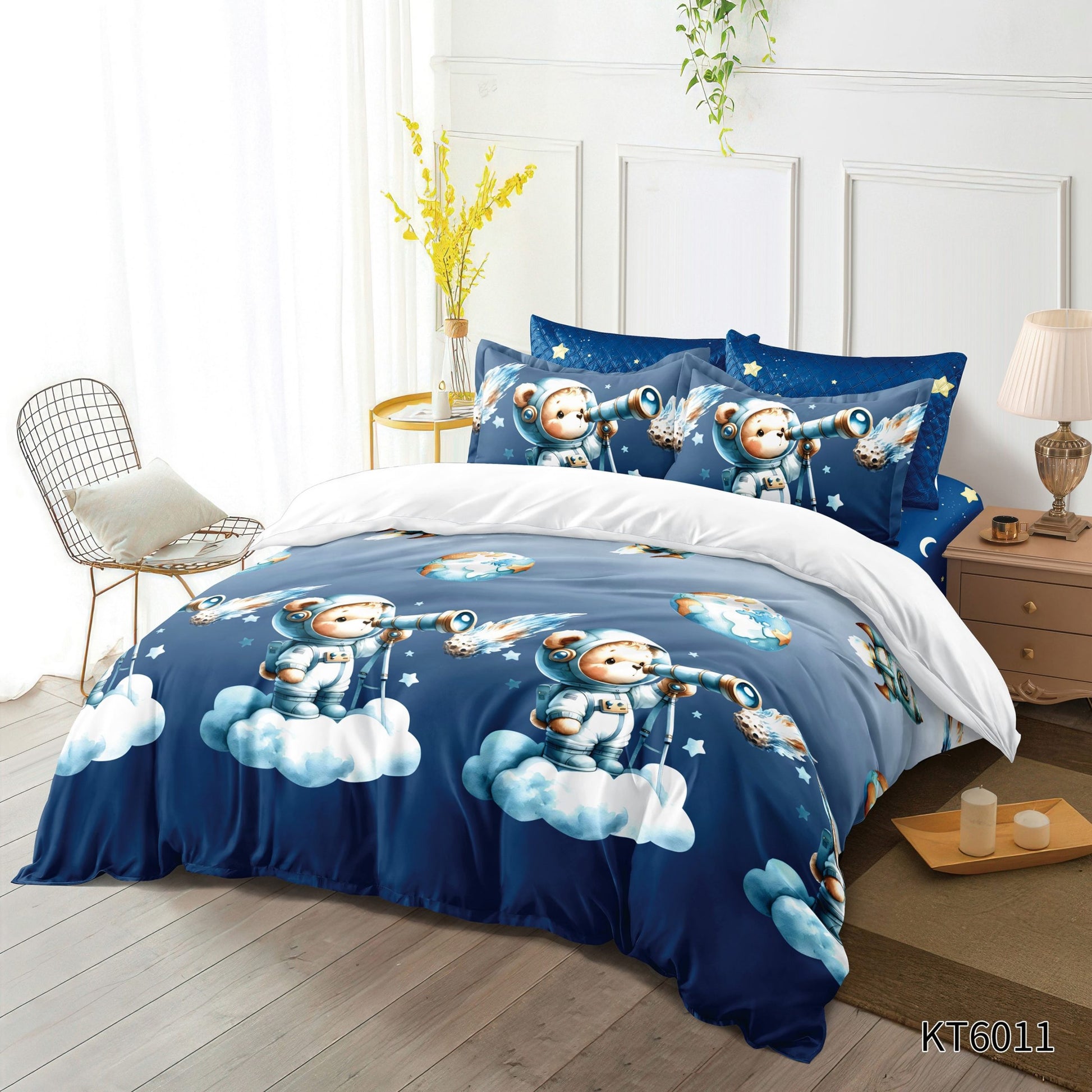 Lenjeria de pat are doua fete, pe o parte un imprimeu, pe cealalta alt imprimeu, astfe ca poti de fiecare data sa schimbi decorul camerei.