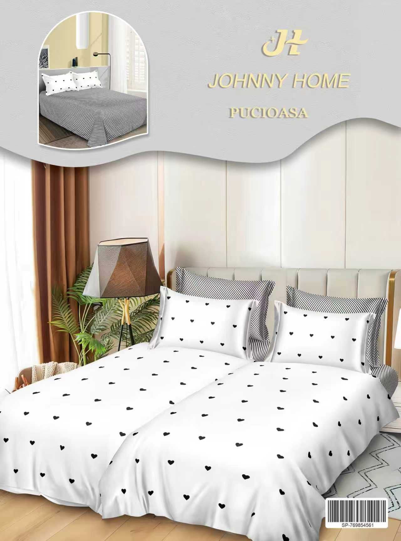 Lenjerie Pat Dublu Bumbac Satinat 7 Piese, cu 2 Cearceafuri de pilota, Inimi-H8796