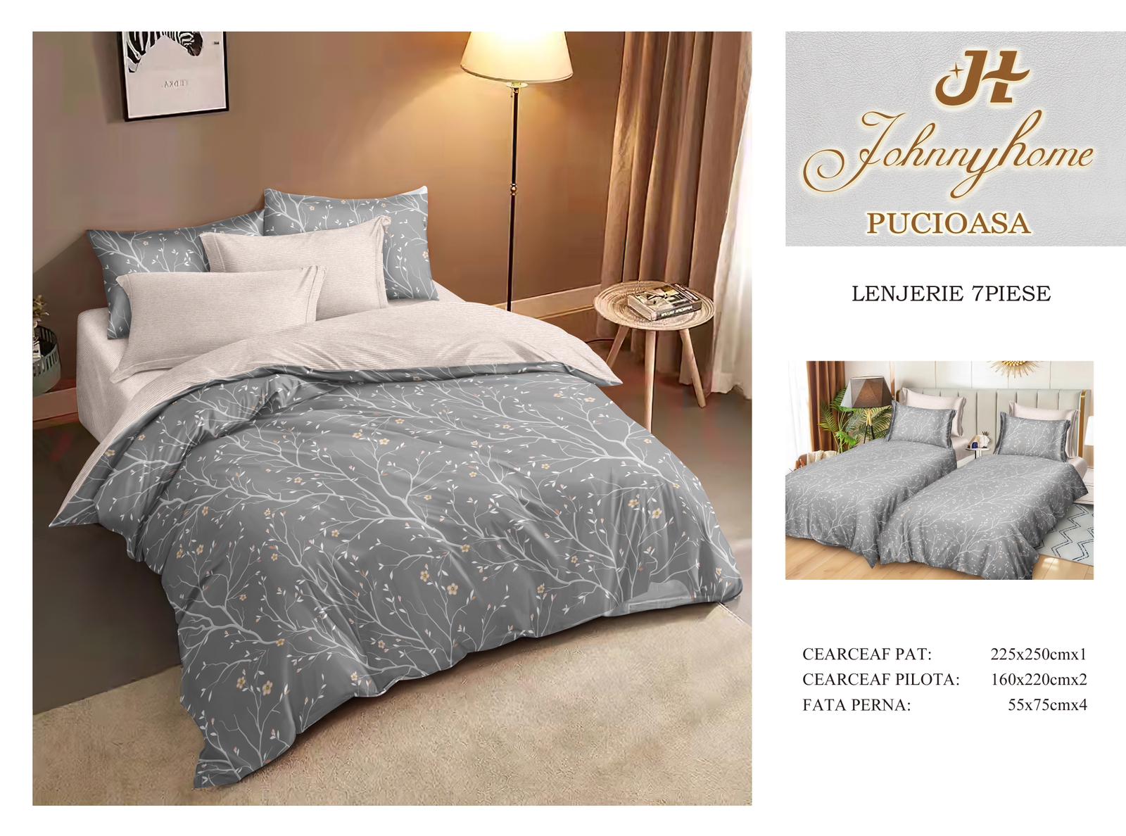 Lenjerie Pat Dublu Bumbac Satinat 7 Piese, cu 2 Cearceafuri de pilota, Ramuri-H8803