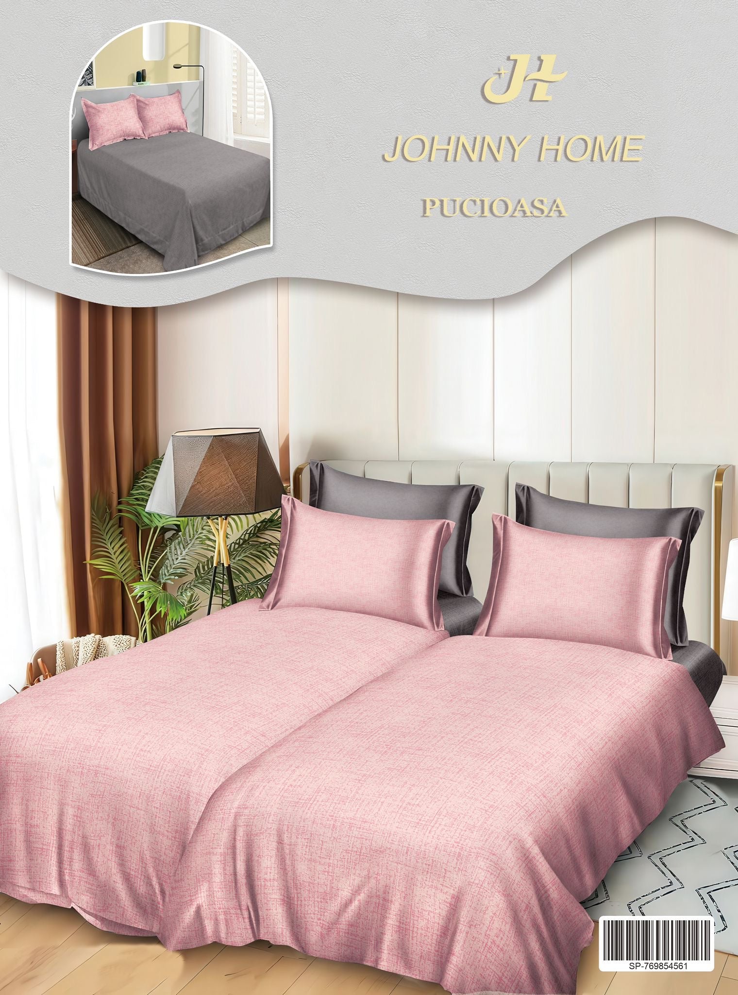 Lenjerie Pat Dublu Bumbac Satinat 7 Piese, cu 2 Cearceafuri de pilota, Roz/Gri-H8794