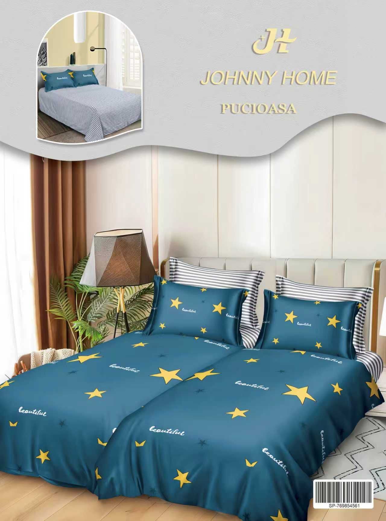 Lenjerie Pat Dublu Bumbac Satinat 7 Piese, cu 2 Cearceafuri de pilota, Stele-H8804
