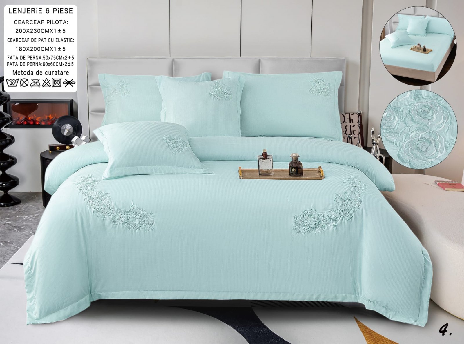 Descoperă confortul suprem cu setul nostru exclusiv de lenjerii de pat, acum disponibil pe casadeluxe.ro! Fabricată din bumbac de înaltă calitate, această lenjerie de pat oferă o senzație de moale și plăcută la atingere, ideală pentru un somn odihnitor. Setul este compus din 6 piese esențiale pentru orice dormitor modern: cearșaf de pat cu elastic, cearșaf de pilota, și patru fețe de pernă.