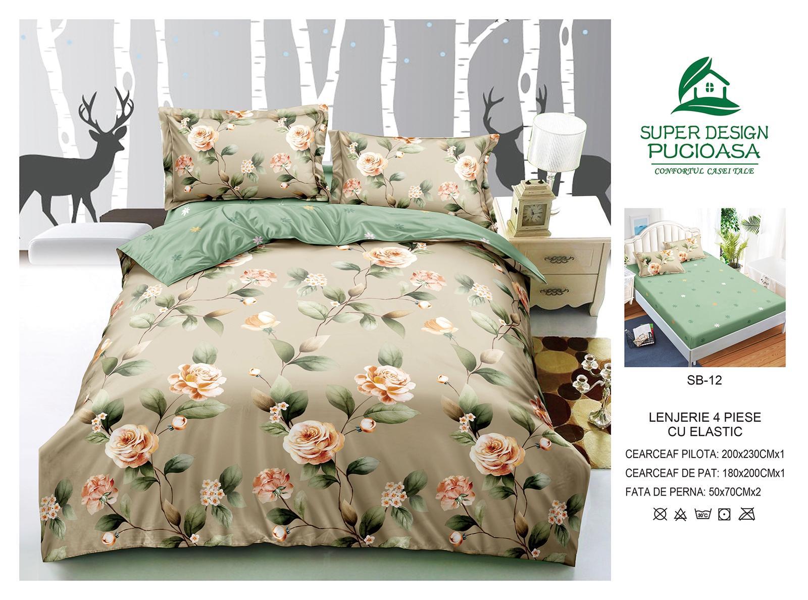 Lenjerie Pat Dublu cu Elastic din Bumbac Satinat Superior cu 4 Piese, Flori-V8745