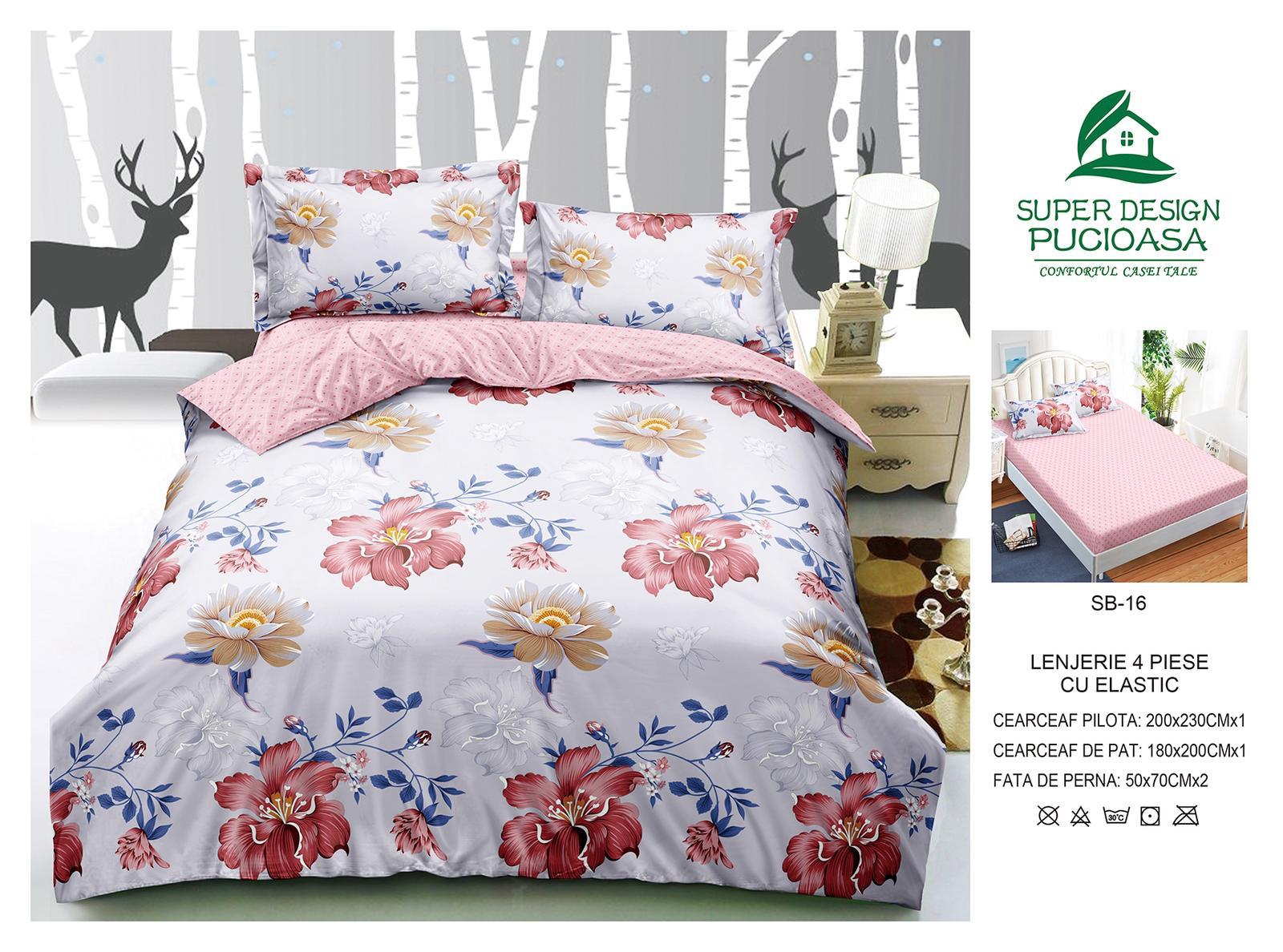 Lenjerie Pat Dublu cu Elastic din Bumbac Satinat Superior cu 4 Piese, Floricele-V8742
