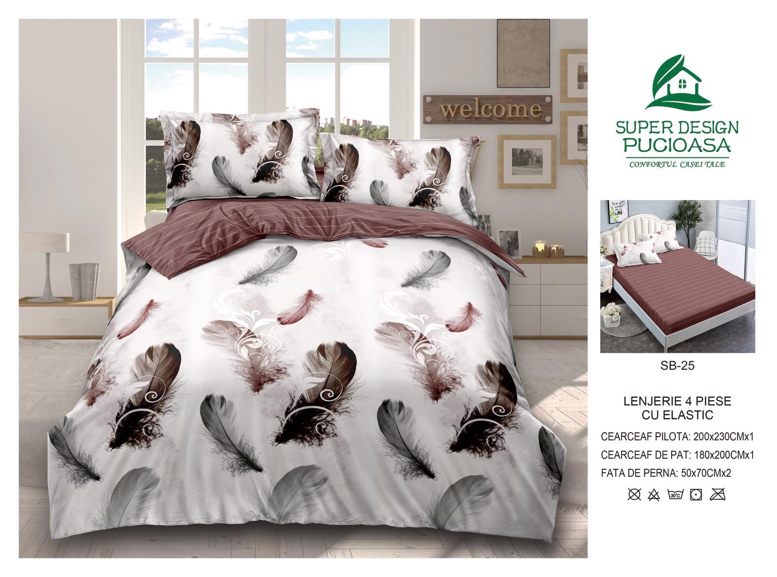 Lenjerie Pat Dublu cu Elastic din Bumbac Satinat Superior cu 4 Piese, Pene-V8753