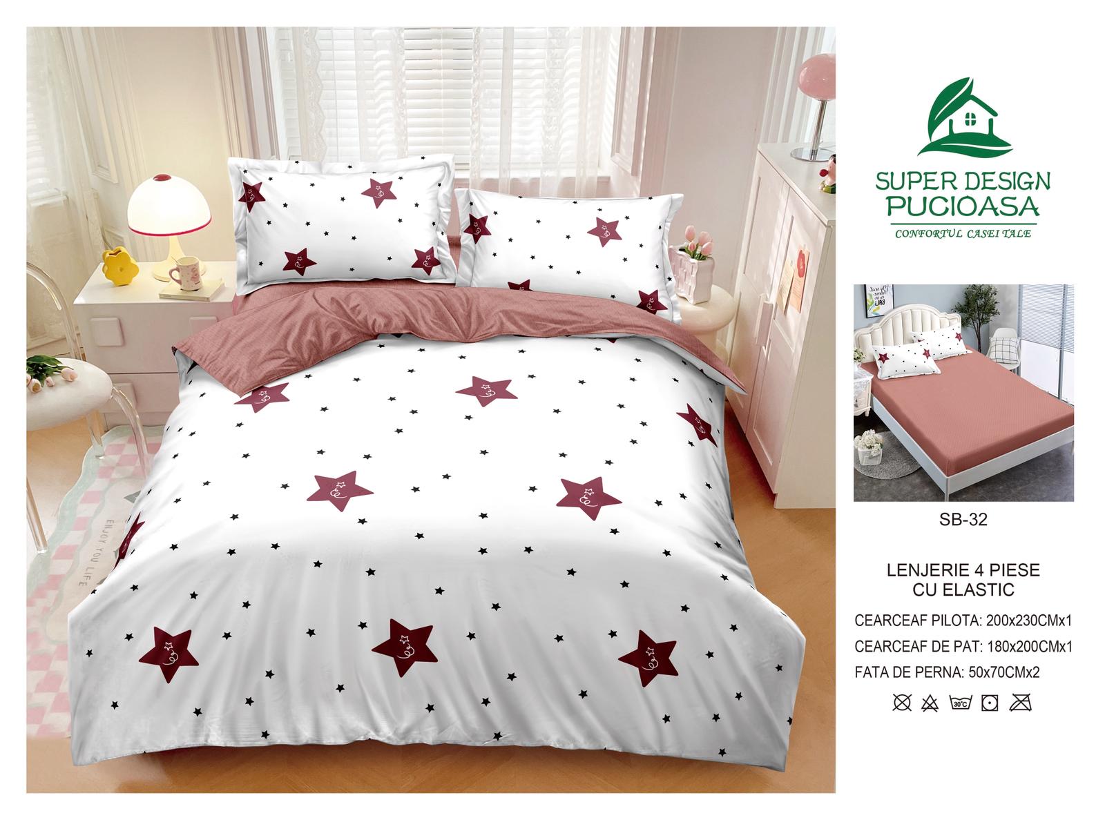 Lenjerie Pat Dublu cu Elastic din Bumbac Satinat Superior cu 4 Piese, Stele-V8751