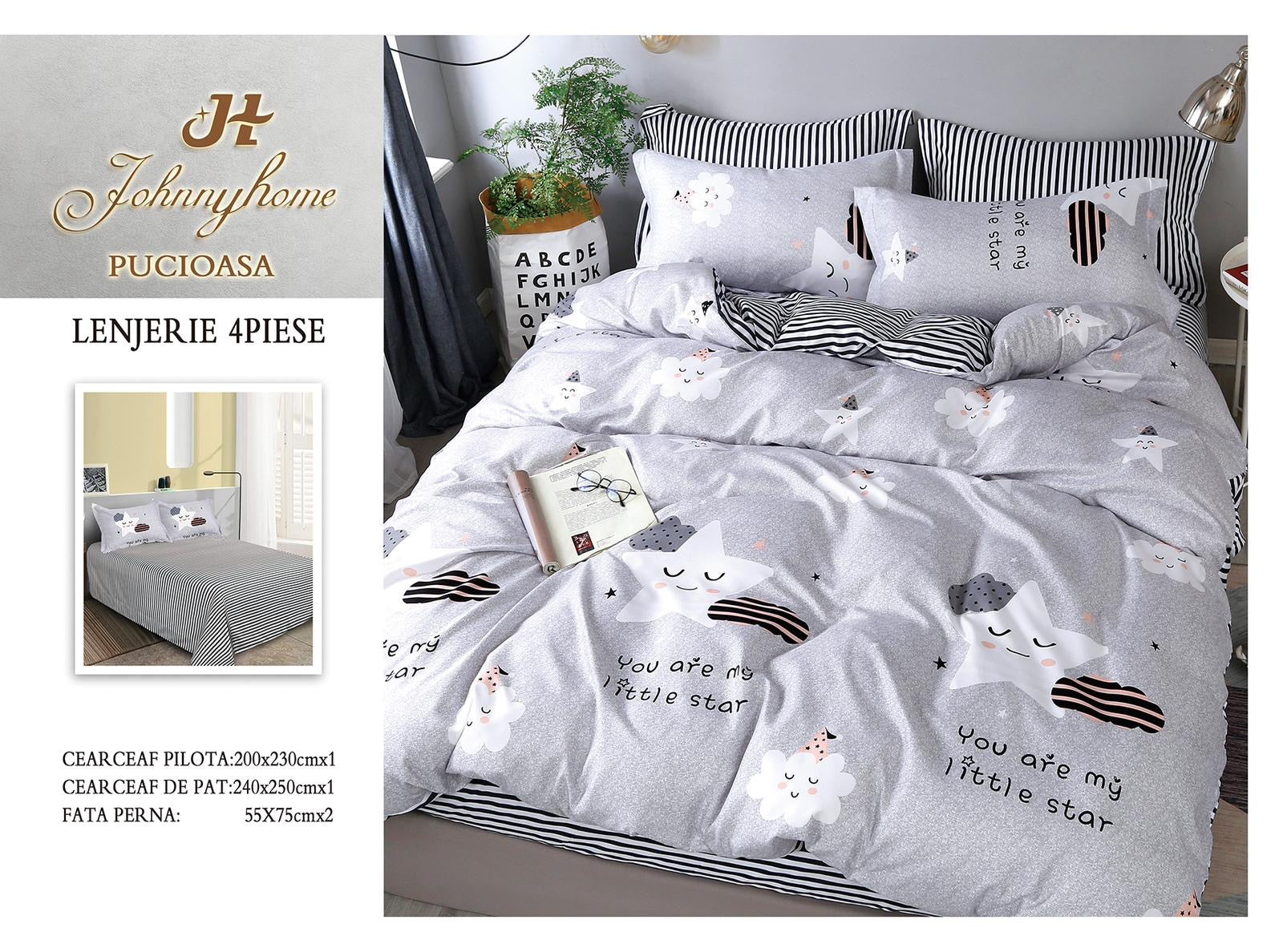 Lenjerie Pat Dublu cu Elastic din Bumbac Satinat Superior cu 4 Piese, Stelute/Norisori-H8747
