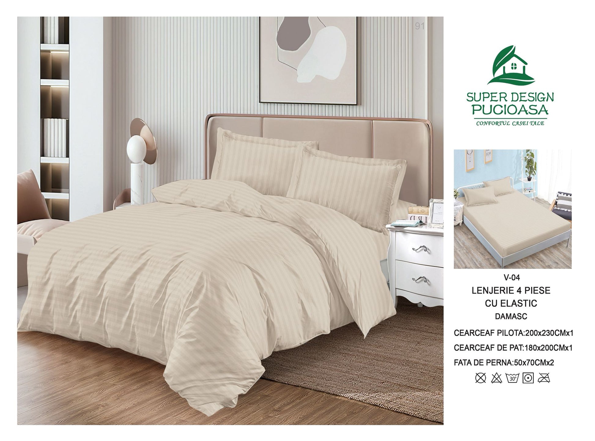 Lenjerie Pat Dublu din Damasc Finetat, 4 Piese cu Elastic, Model Dungat, Bej-V8287