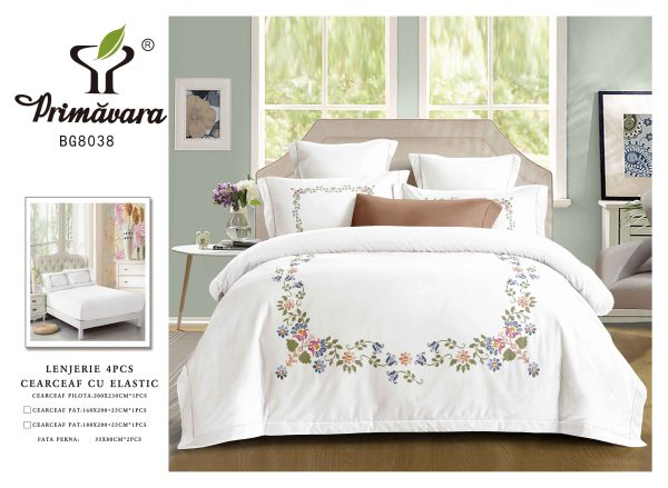Lenjerie Pat Dublu din Finet, 4 Piese, cu Elastic, Model Elegant cu Flori, Alb-P9601
