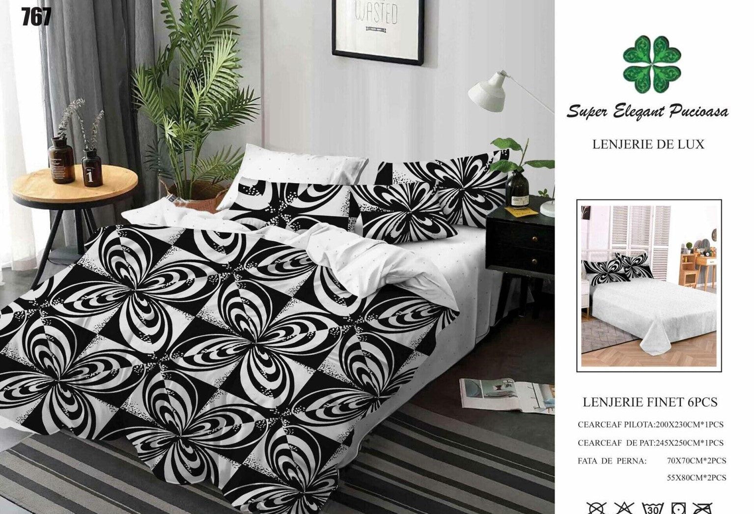 Lenjerie Pat Dublu din Finet, 6 Piese, Alb/Negru-SEP9092