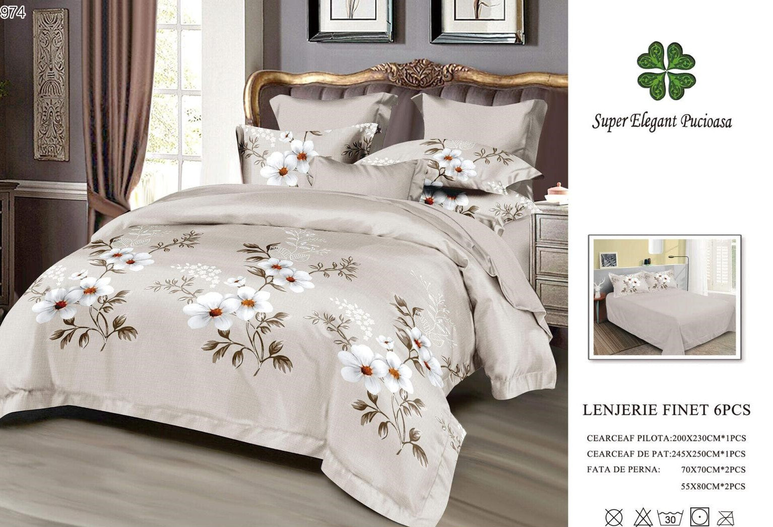 Lenjerie Pat Dublu din Finet, 6 Piese, Bej/Flori-SEP9075