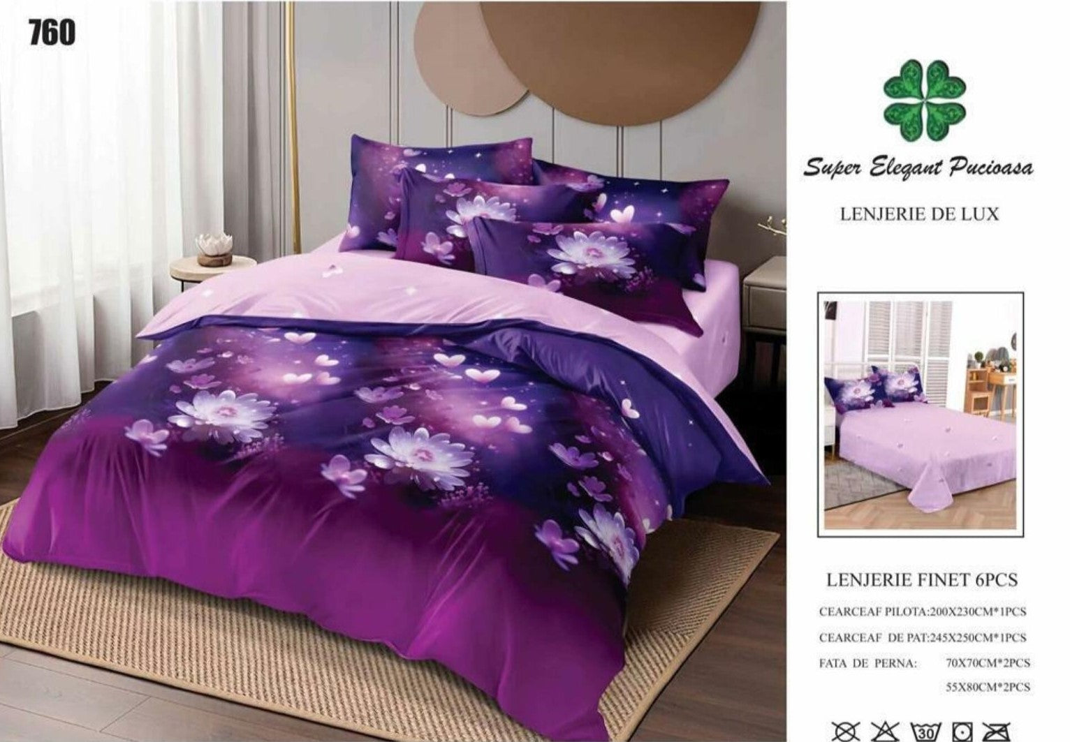 Lenjerie Pat Dublu din Finet, 6 Piese, Flori/Inimi-SEP9100