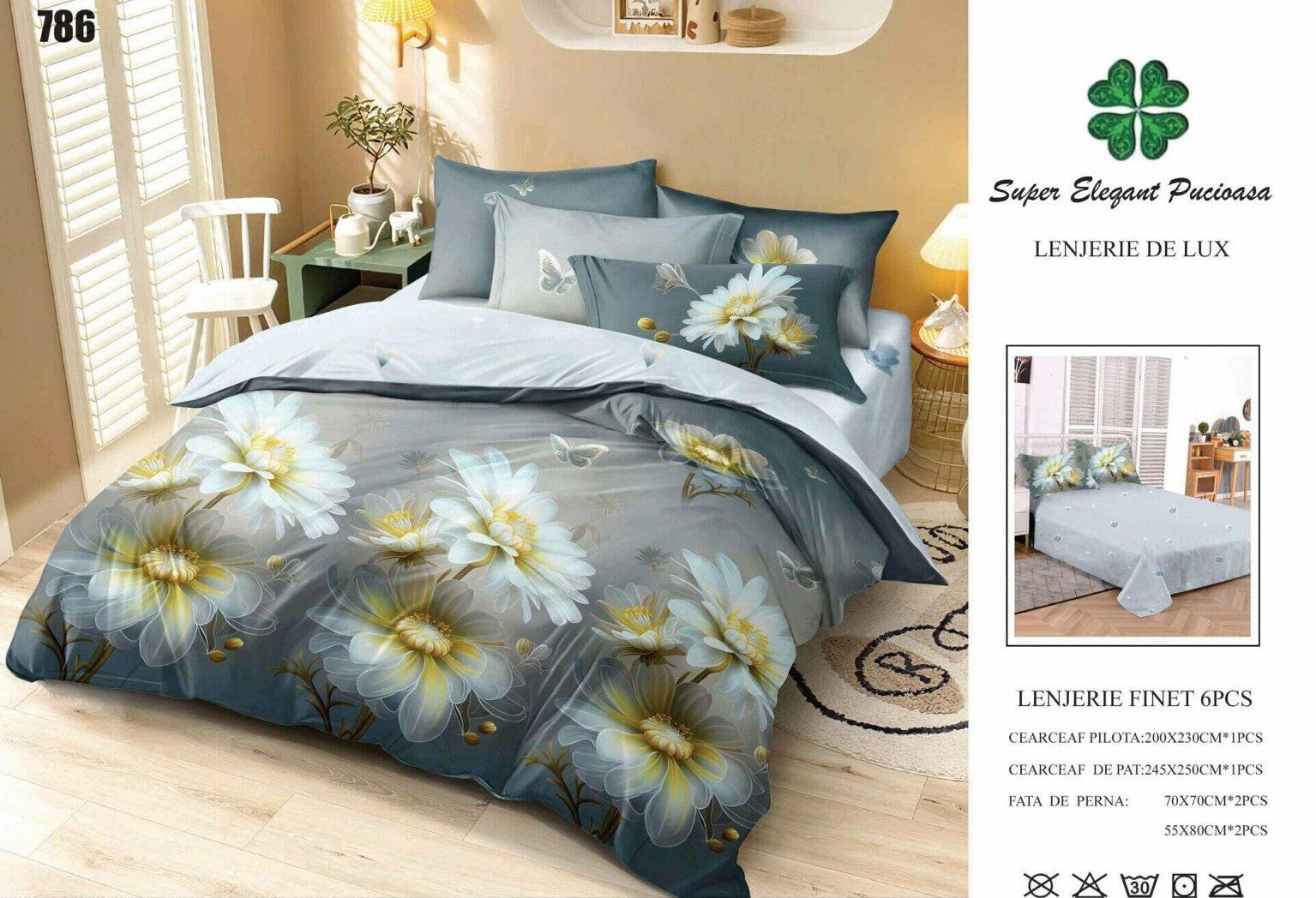Lenjerie Pat Dublu din Finet, 6 Piese, Gri/Flori-SEP9107