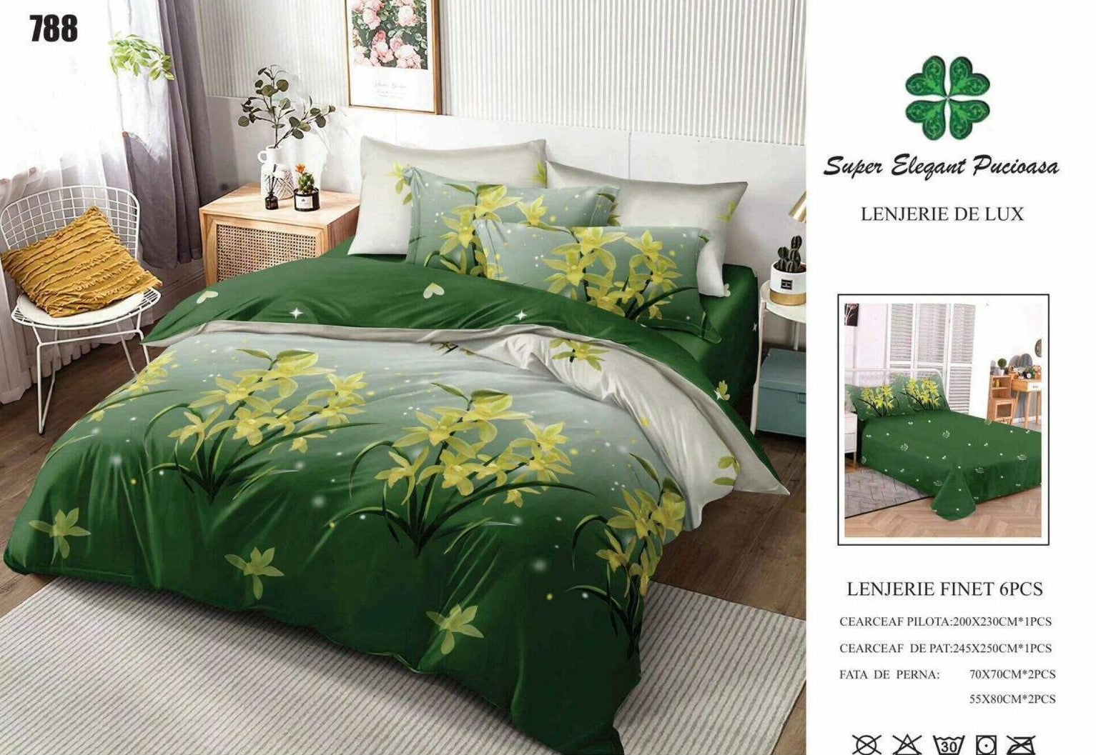 Lenjerie Pat Dublu din Finet, 6 Piese, Verde/Flori-SEP9077