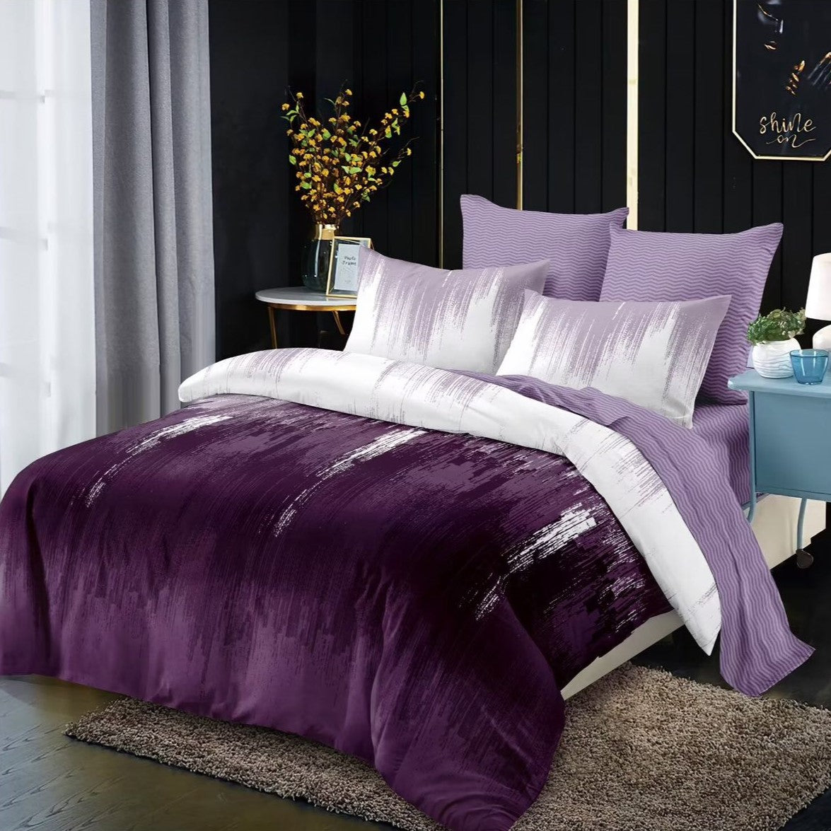 Lenjeria de pat are doua fete, pe o parte un imprimeu, pe cealalta alt imprimeu, astfe ca poti de fiecare data sa schimbi decorul camerei.