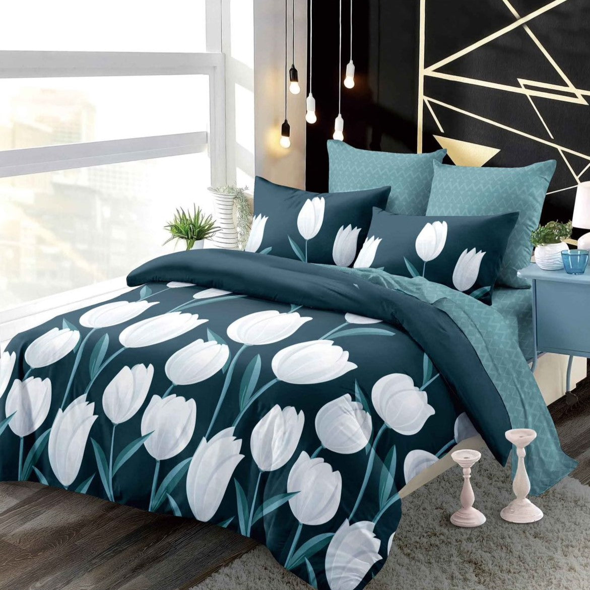 Lenjeria de pat are doua fete, pe o parte un imprimeu, pe cealalta alt imprimeu, astfe ca poti de fiecare data sa schimbi decorul camerei.