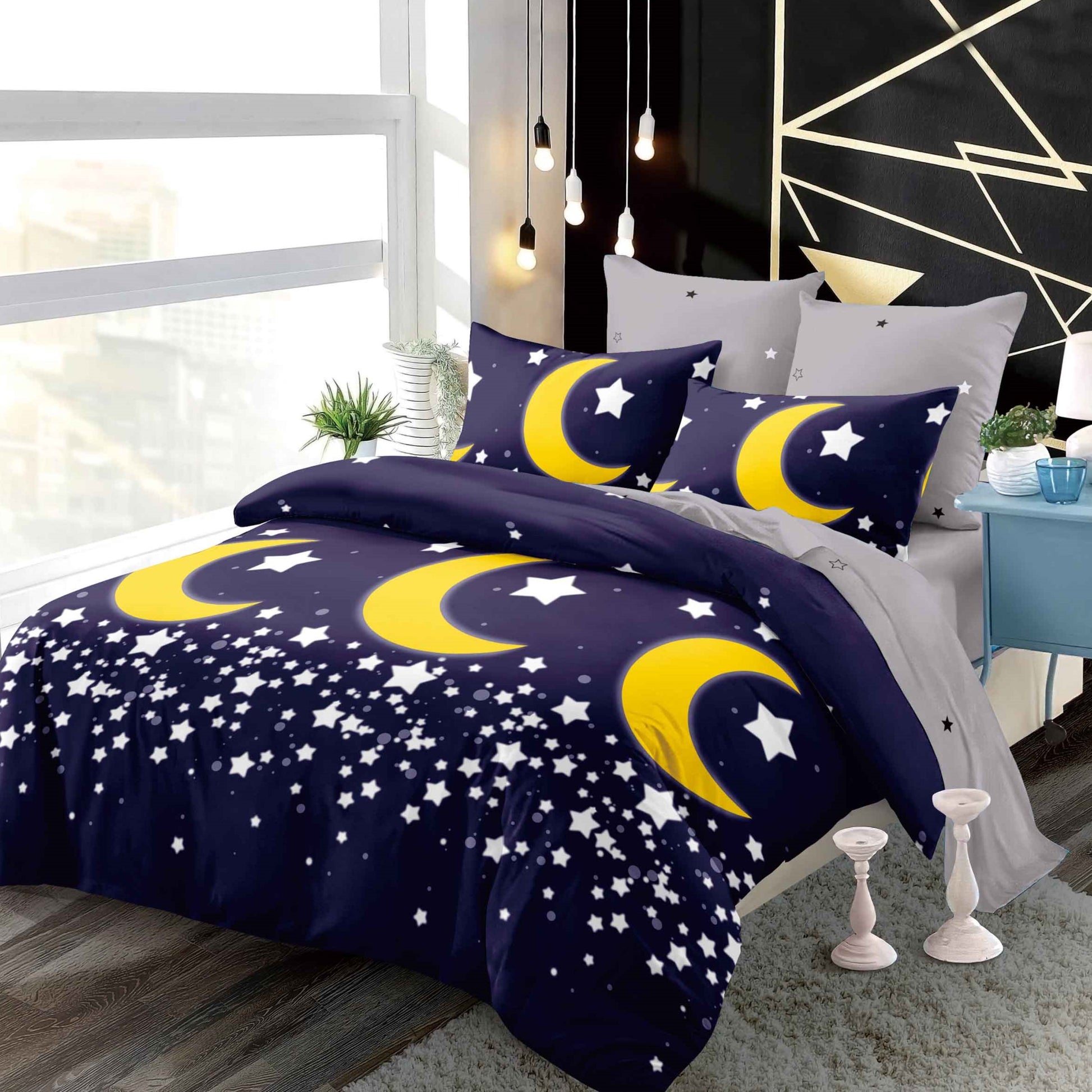 Lenjeria de pat are doua fete, pe o parte un imprimeu, pe cealalta alt imprimeu, astfe ca poti de fiecare data sa schimbi decorul camerei.