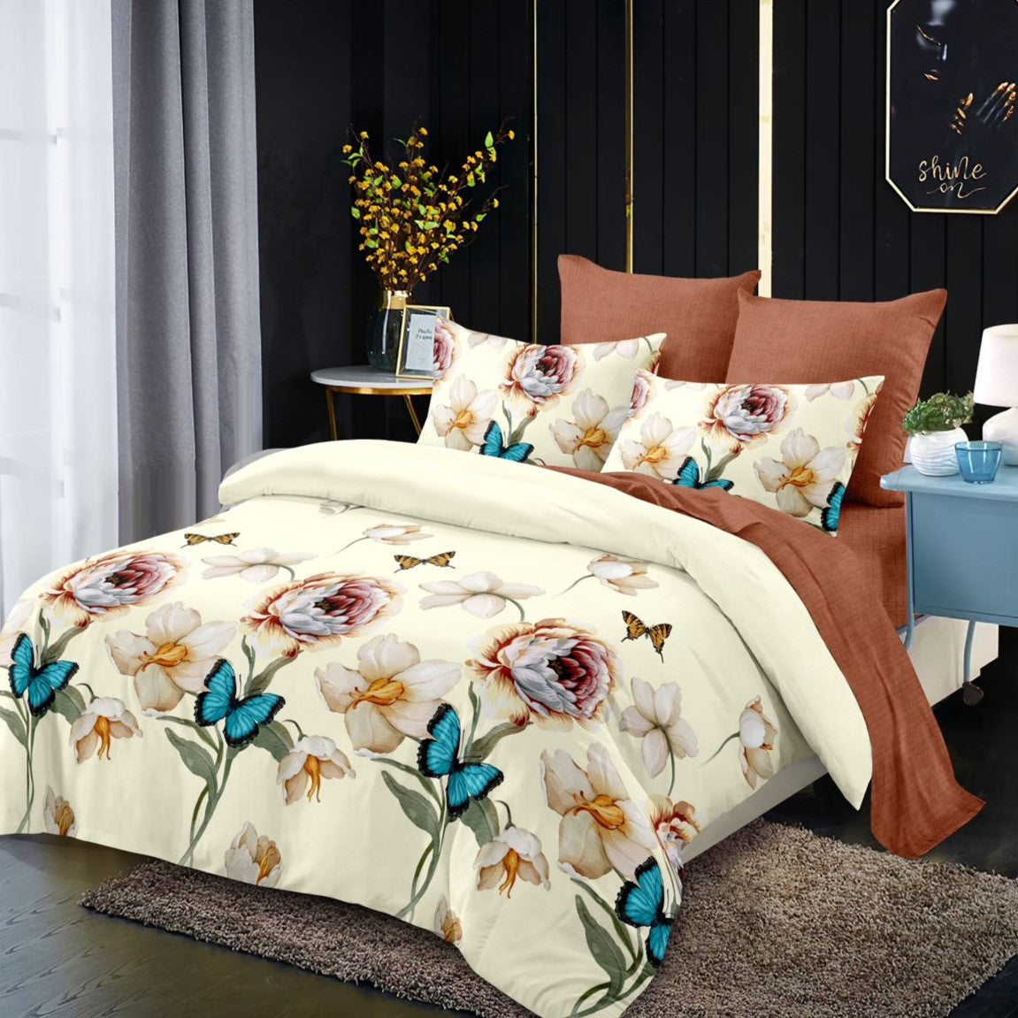 Lenjeria de pat are doua fete, pe o parte un imprimeu, pe cealalta alt imprimeu, astfe ca poti de fiecare data sa schimbi decorul camerei.