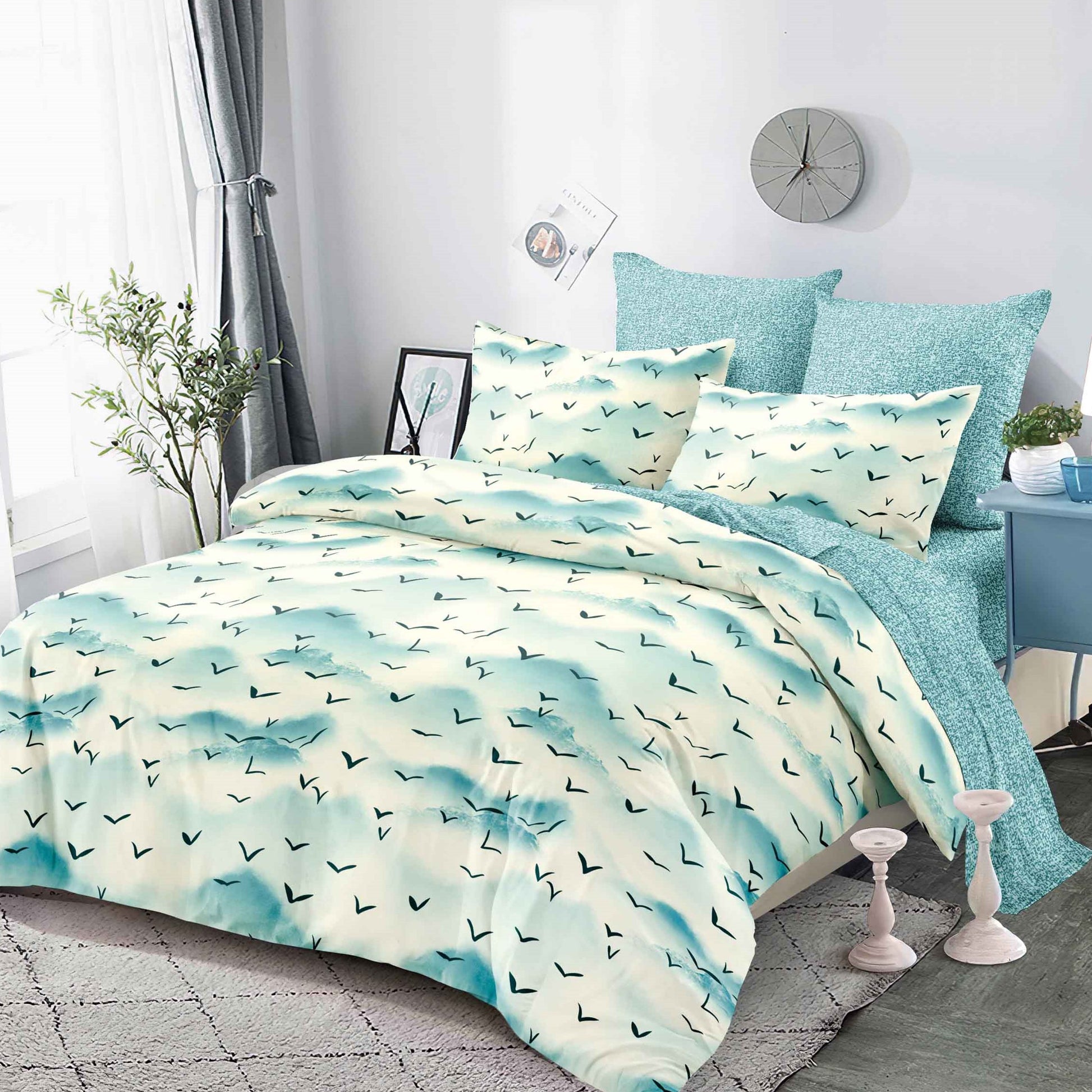 Lenjeria de pat are doua fete, pe o parte un imprimeu, pe cealalta alt imprimeu, astfe ca poti de fiecare data sa schimbi decorul camerei.