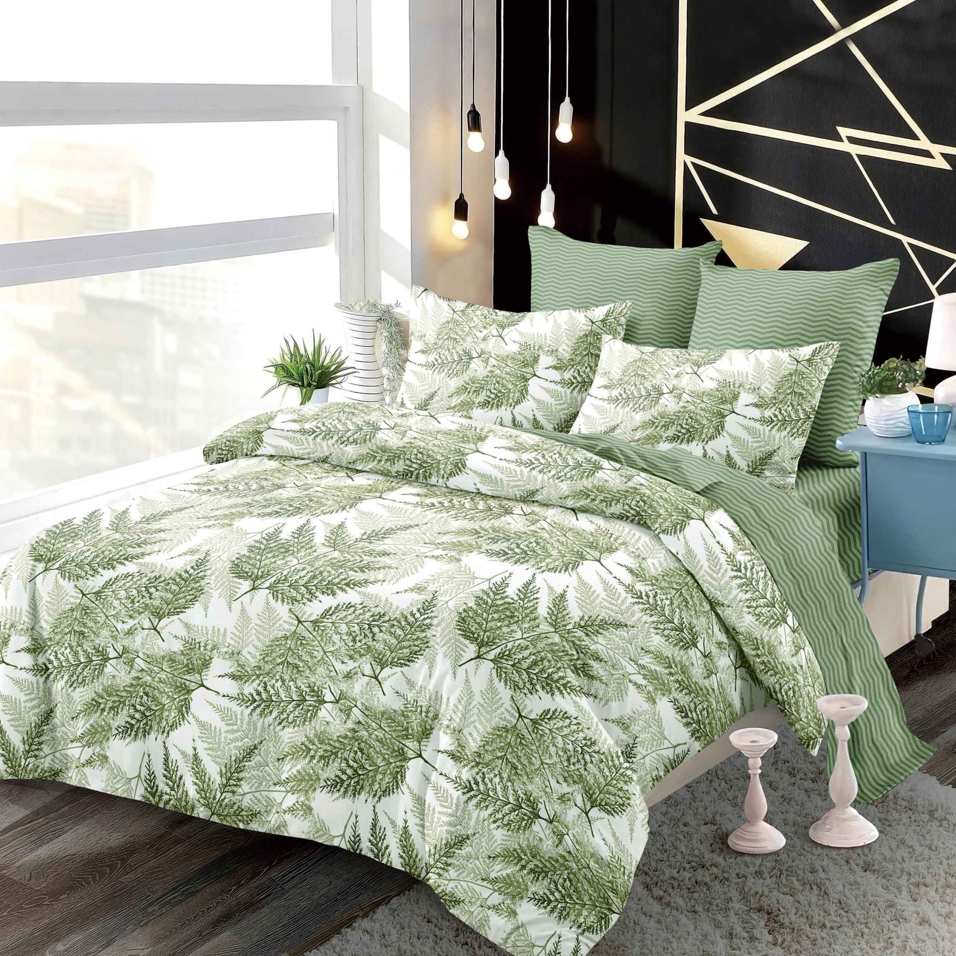 Lenjeria de pat are doua fete, pe o parte un imprimeu, pe cealalta alt imprimeu, astfe ca poti de fiecare data sa schimbi decorul camerei.