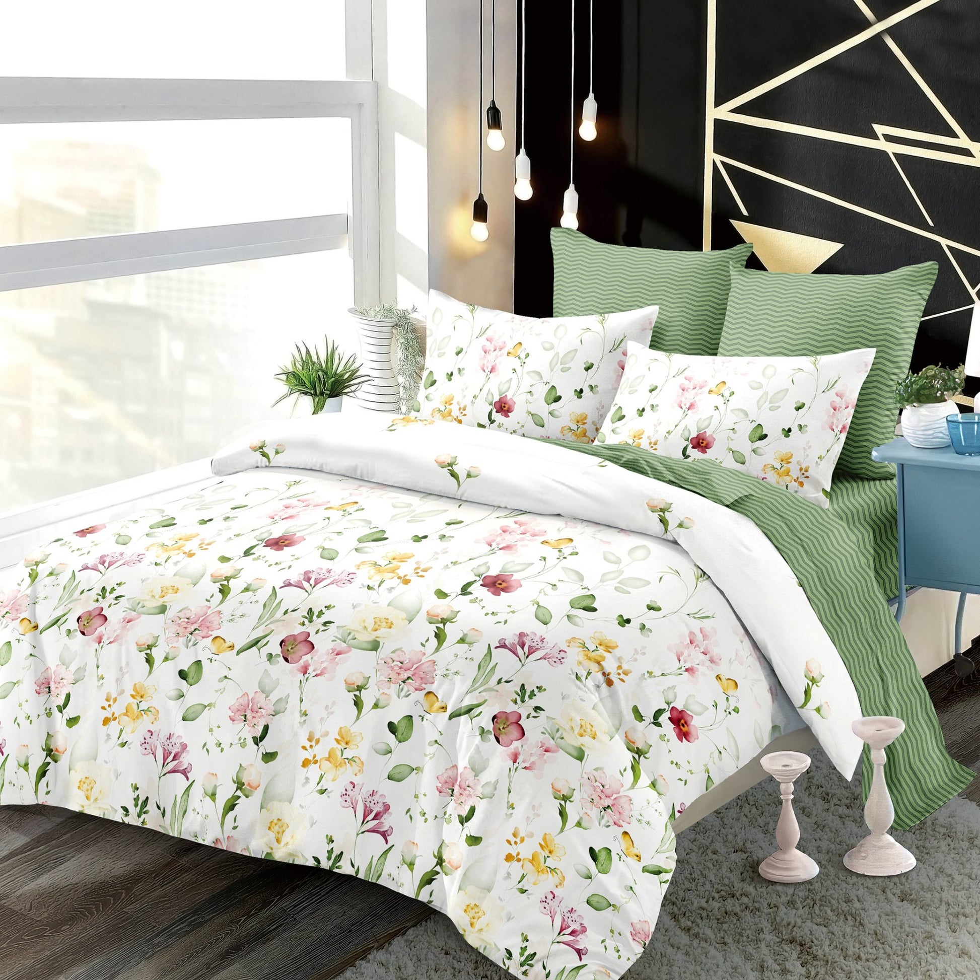 Lenjeria de pat are doua fete, pe o parte un imprimeu, pe cealalta alt imprimeu, astfe ca poti de fiecare data sa schimbi decorul camerei.
