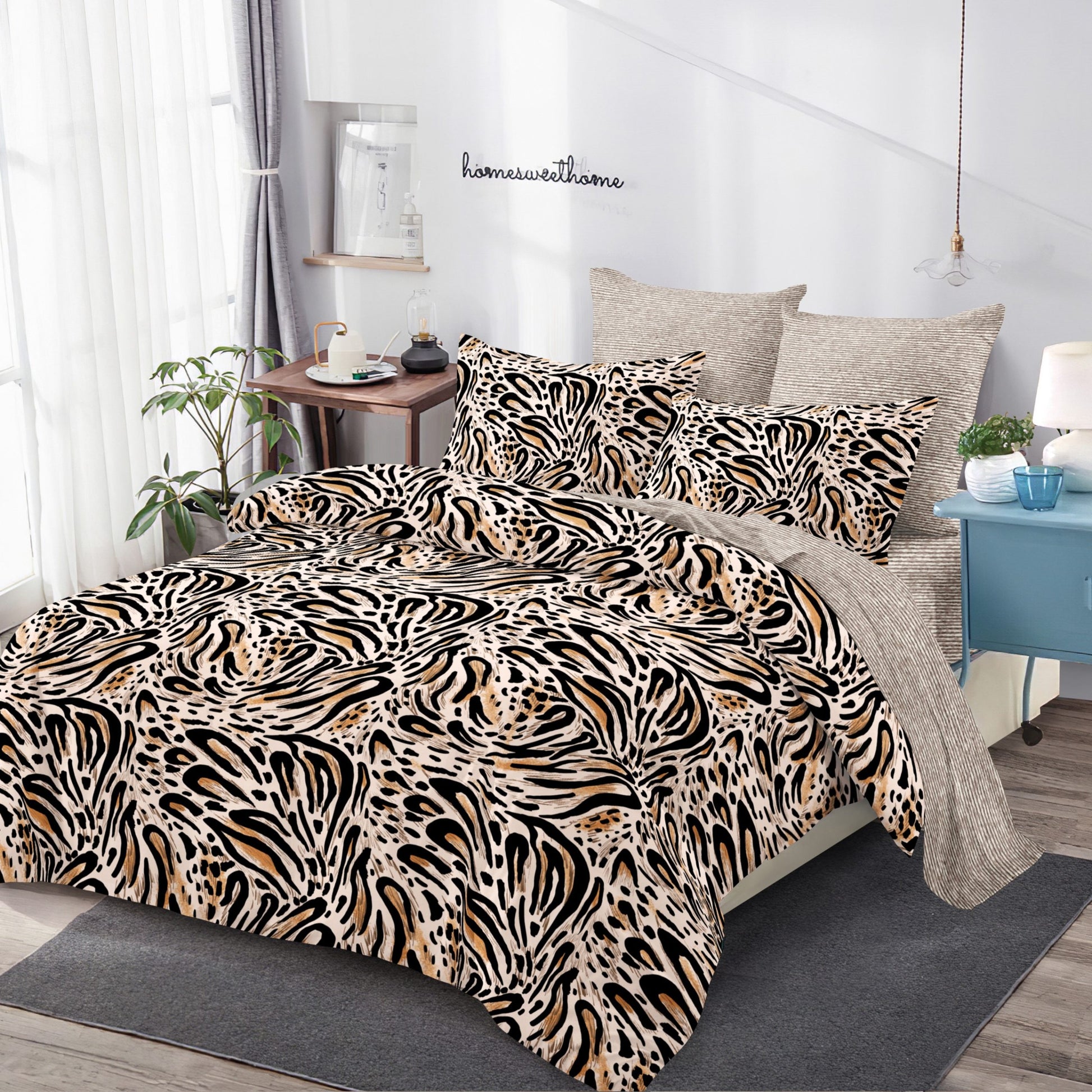 Lenjeria de pat are doua fete, pe o parte un imprimeu, pe cealalta alt imprimeu, astfe ca poti de fiecare data sa schimbi decorul camerei.