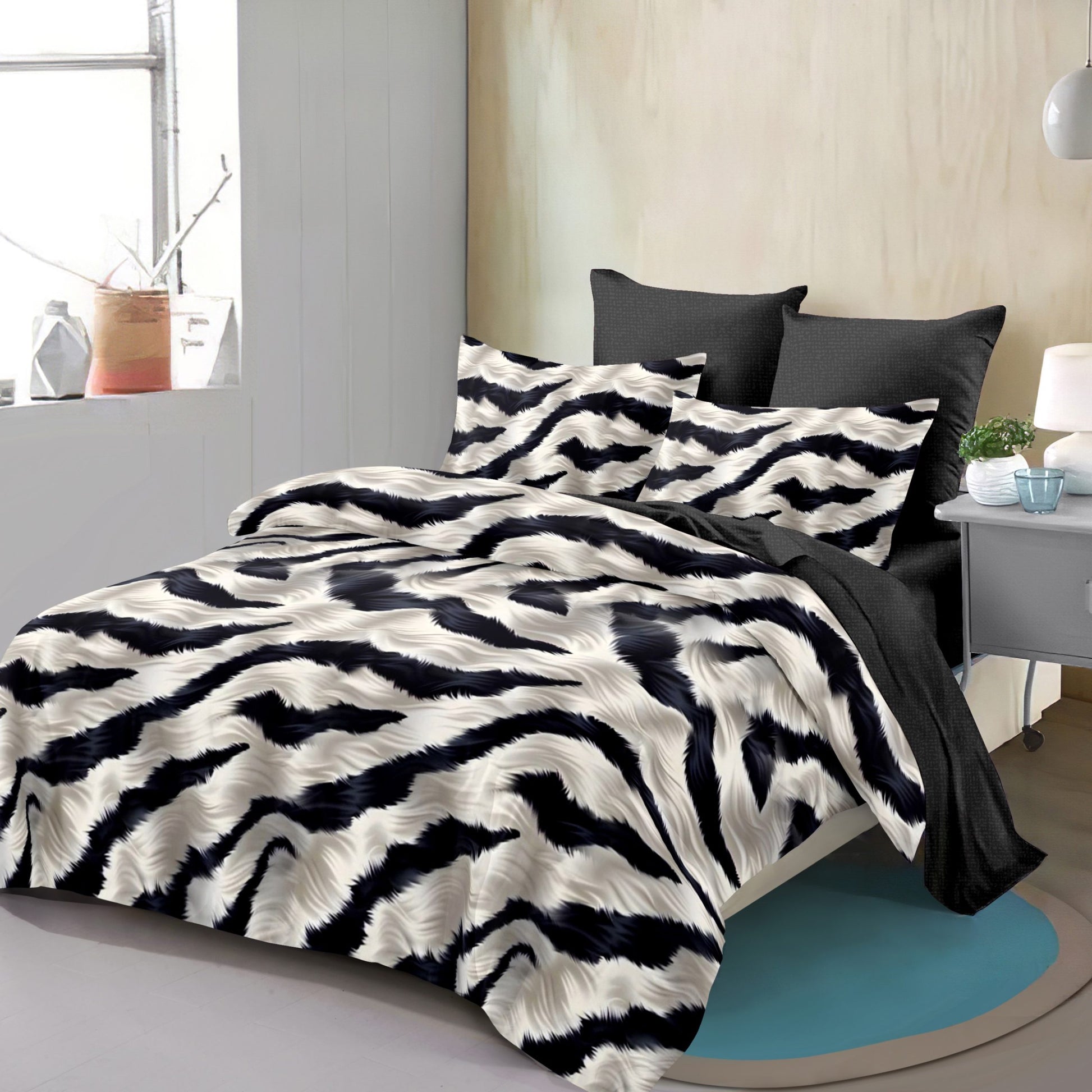 Lenjeria de pat are doua fete, pe o parte un imprimeu, pe cealalta alt imprimeu, astfe ca poti de fiecare data sa schimbi decorul camerei.