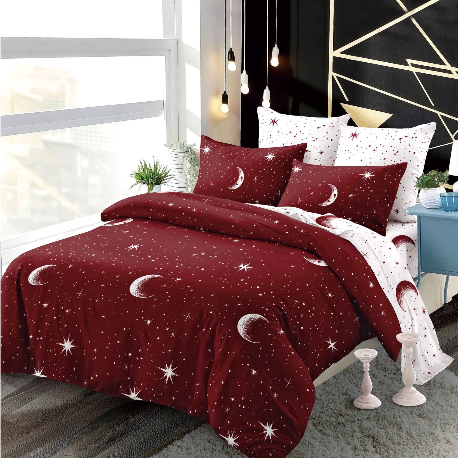 Lenjeria de pat are doua fete, pe o parte un imprimeu, pe cealalta alt imprimeu, astfe ca poti de fiecare data sa schimbi decorul camerei.