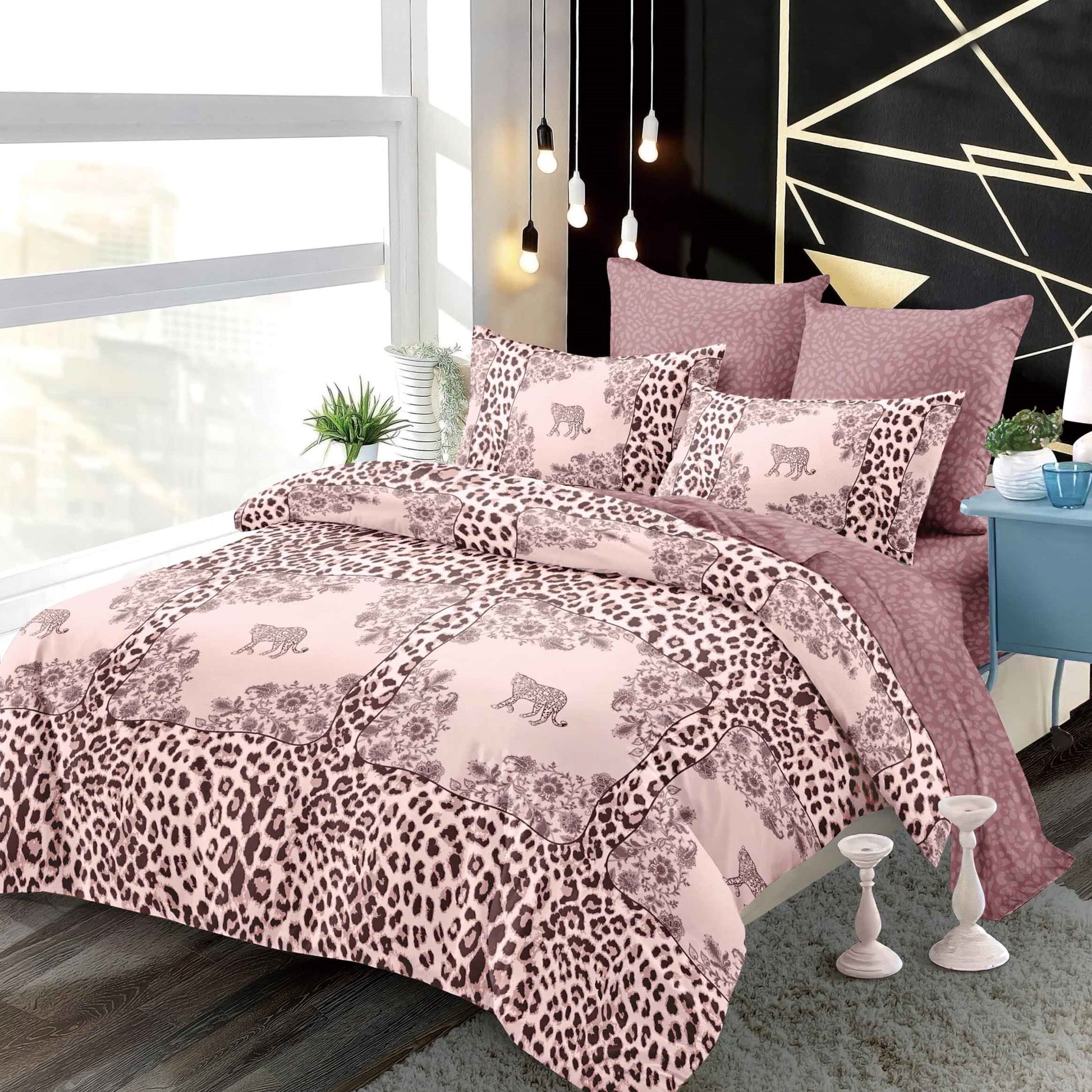 Lenjeria de pat are doua fete, pe o parte un imprimeu, pe cealalta alt imprimeu, astfe ca poti de fiecare data sa schimbi decorul camerei.