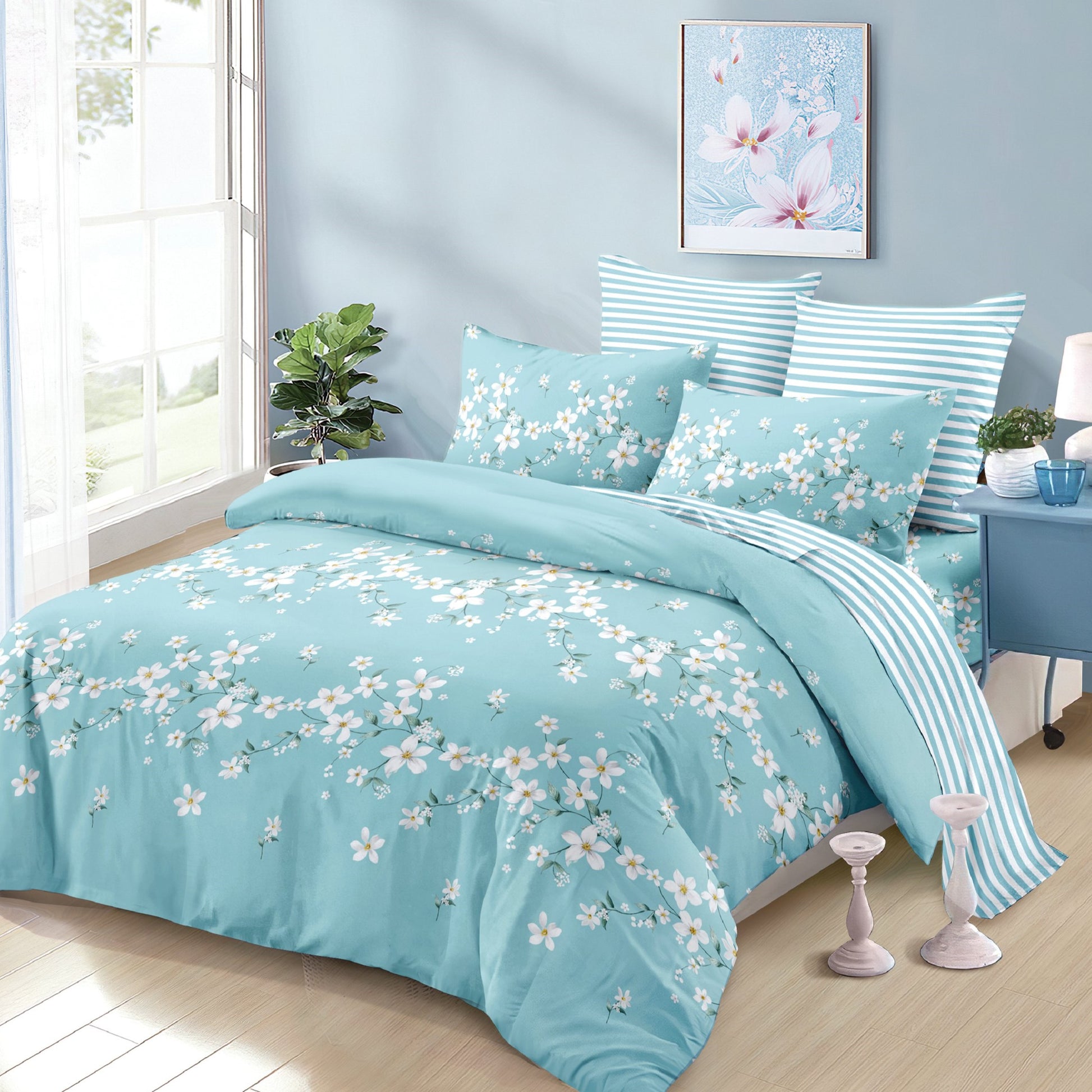 Lenjeria de pat are doua fete, pe o parte un imprimeu, pe cealalta alt imprimeu, astfe ca poti de fiecare data sa schimbi decorul camerei.