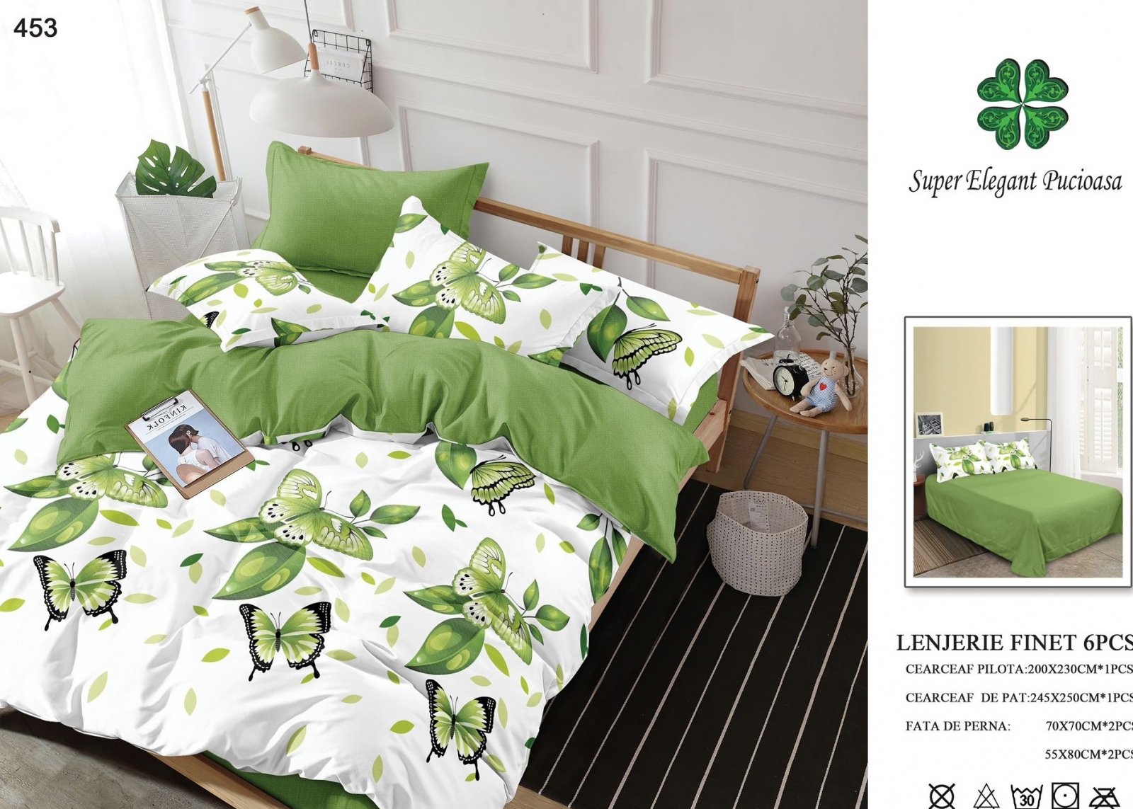 Lenjerie Pat Dublu, Finet, 6 Piese, Fluturi Verzi-SEP7047