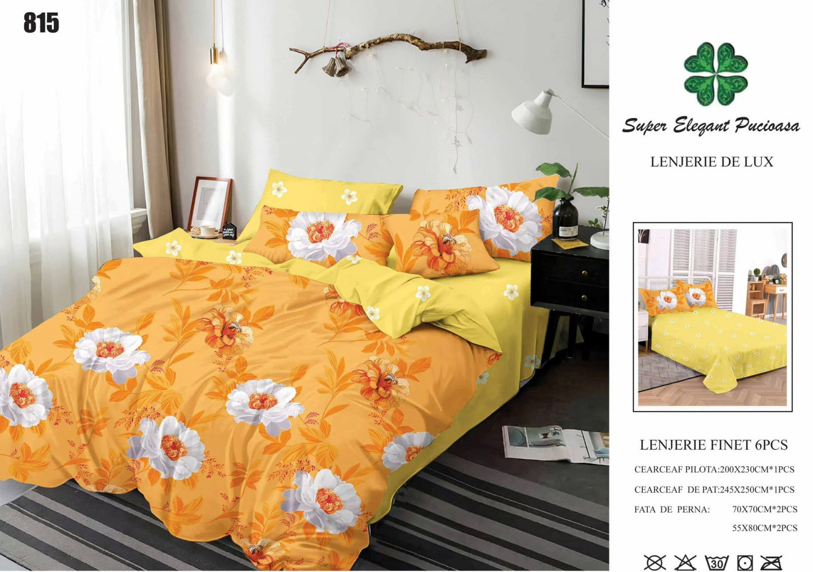 Lenjerie Pat Dublu, Finet, 6 Piese, Galben/Portocaliu/Flori-SEP7042