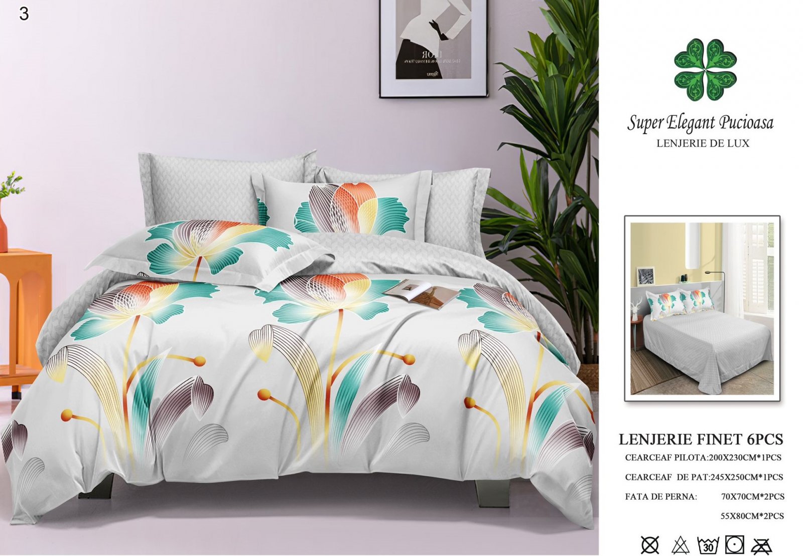 Lenjerie Pat Dublu, Finet, 6 Piese, Gri/Frunze-SEP7040