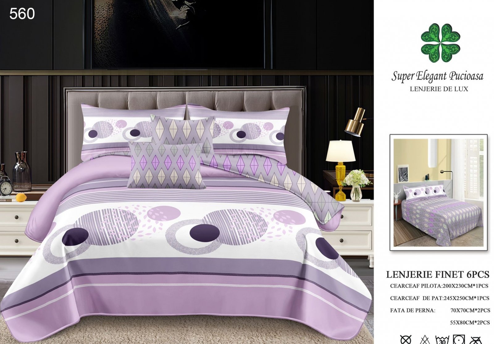 Lenjerie Pat Dublu, Finet, 6 Piese, Lila Abstract-SEP7046