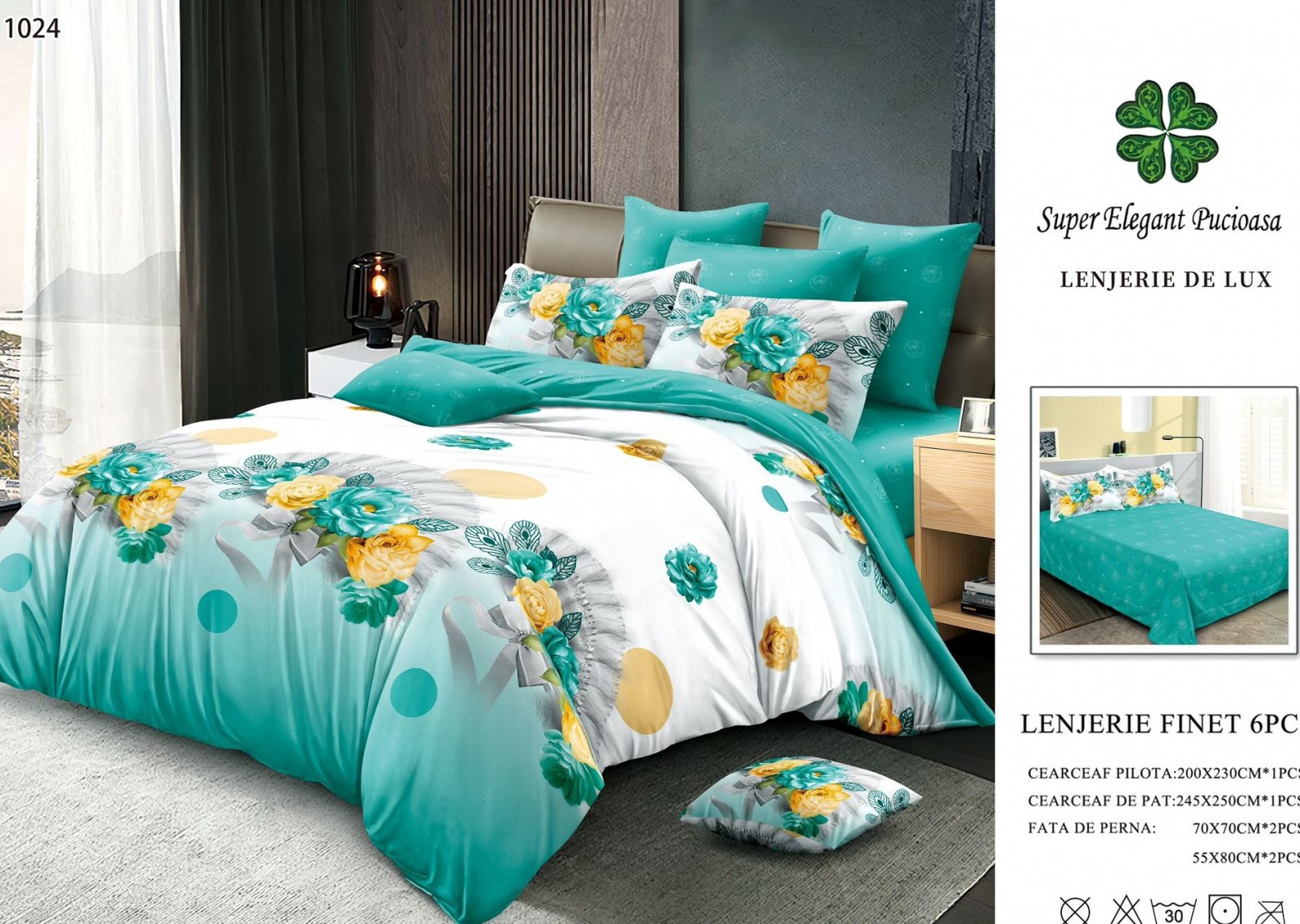 Lenjerie Pat Dublu, Finet, 6 Piese, Vernil/Alb/Flori-SEP7045