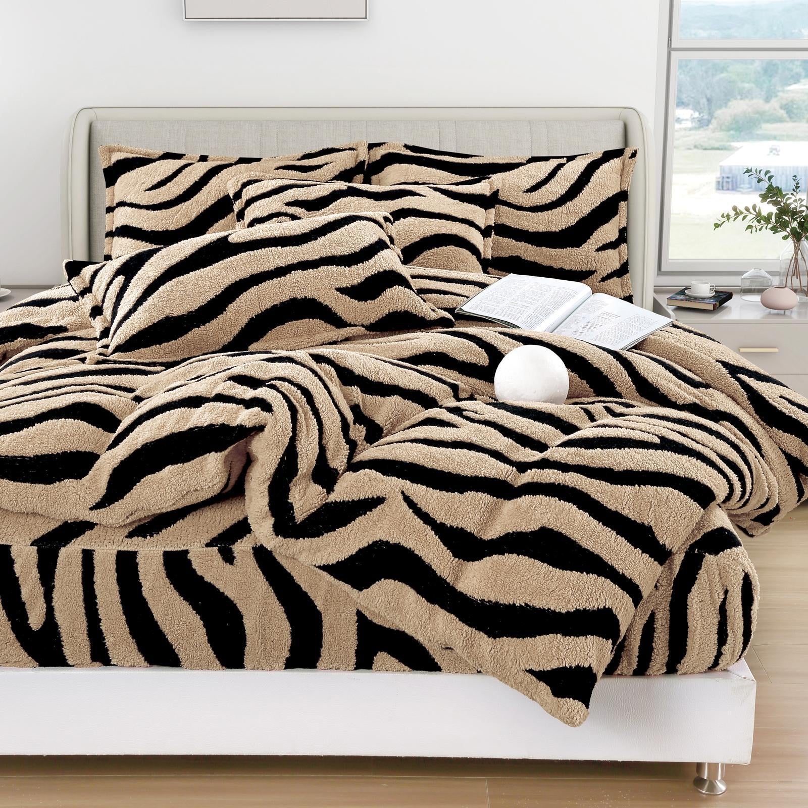 Lenjerie Pat Dublu Super Pufoasă, Cocolino Sherpa, 4 Piese, cu Elastic, Bej/Zebra Print-F9749