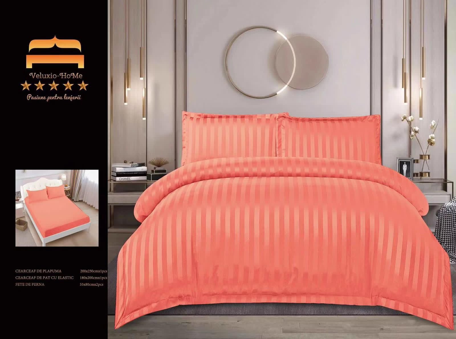 Lenjerie Bumbac Damasc 4 Piese cu Elastic, Portocaliu, Uni-M6349