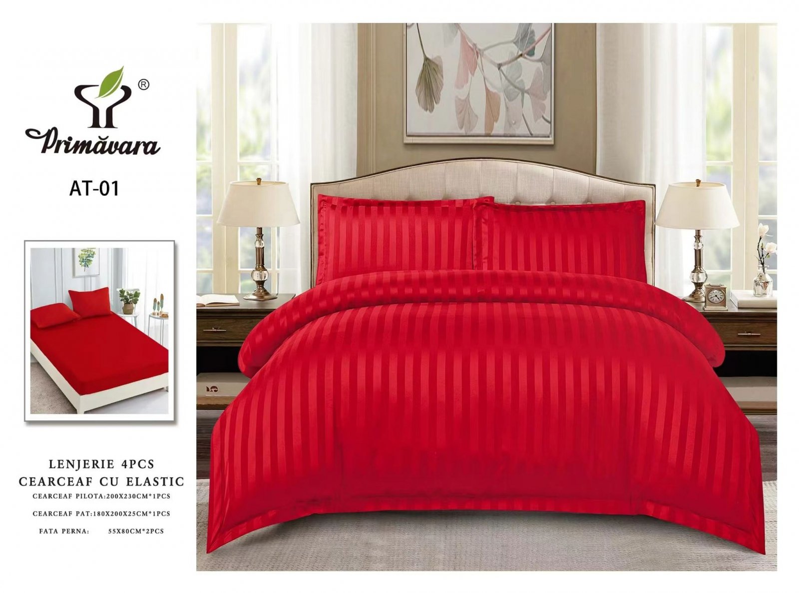Lenjerie Bumbac Damasc 4 Piese cu Elastic, Rosu, Uni-P5276